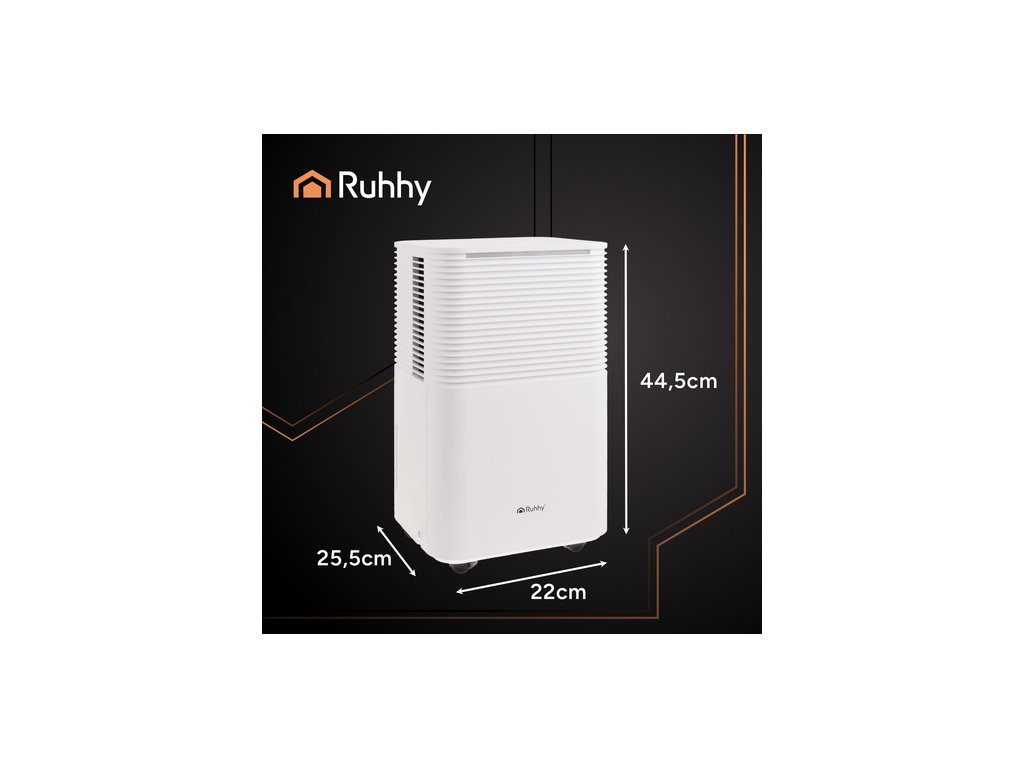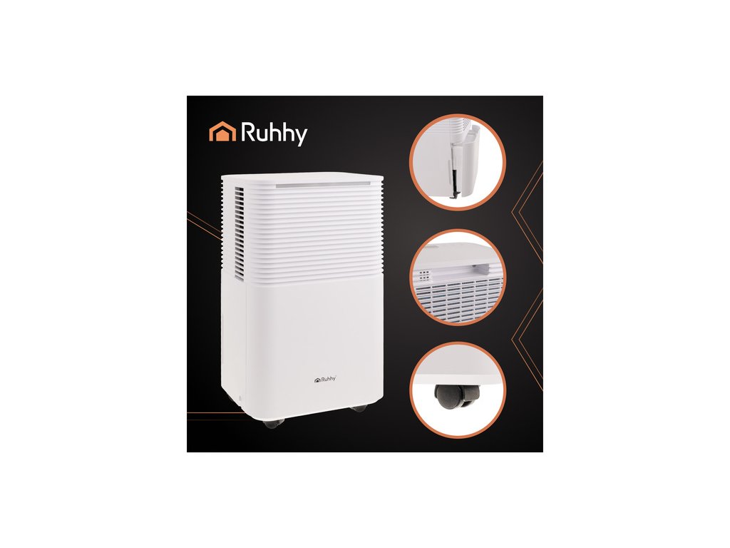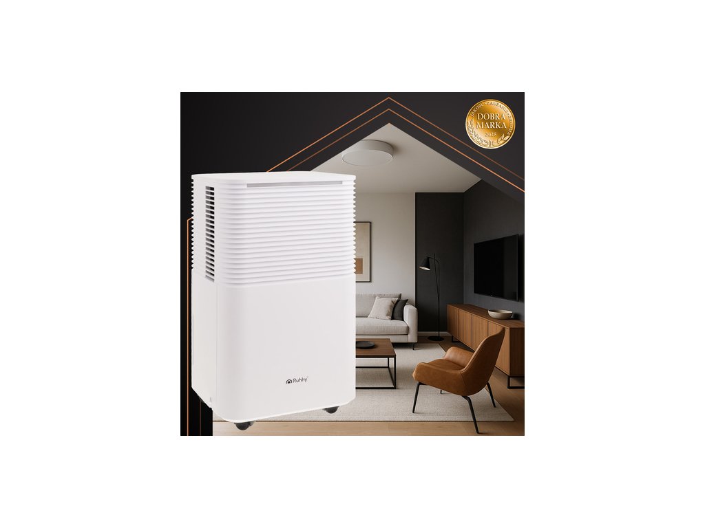 Odvlhčovač vzduchu RUHHY Toto je skutečný gigant mezi odvlhčovači, perfektní řešení pro velké místnosti o velikosti kolem 30 m². Díky automatickému režimu, časovači a ovládání přes Wi-Fi můžete bez námahy udržovat optimální úroveň vlhkosti . Tichý provoz (38 dB), kompaktní velikost a funkce jako automatické odmrazování předurčují toto zařízení do ložnic, sklepů a technických místností.