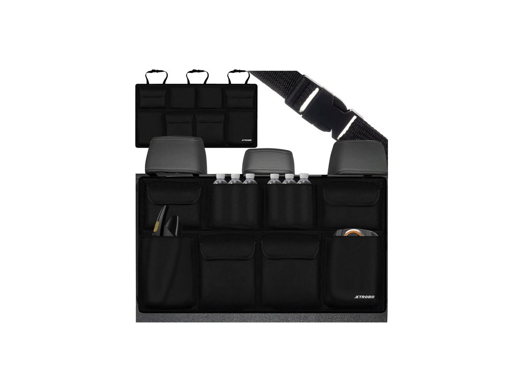 - za jízdy se nepohne - díky silným klipovým zapínáním a dodatečnému suchému zipu na opěradle se organizér vejde do kufru auta zůstává stabilní i na nerovném povrchu a při dynamickém brzdění