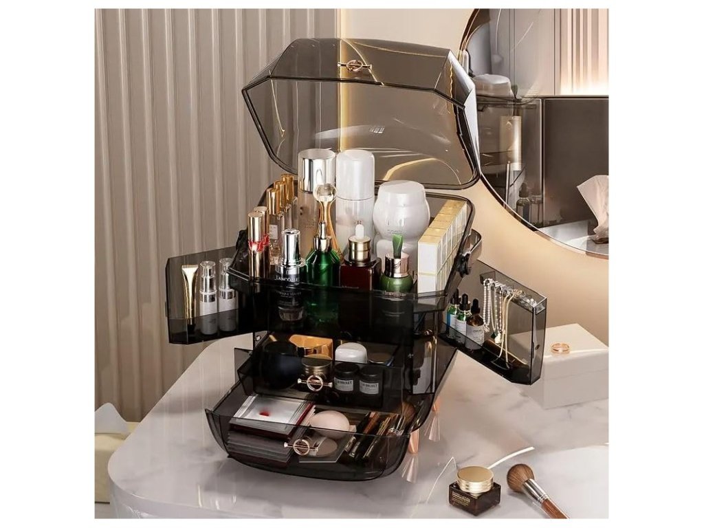 Díky promyšlenému víceúrovňovému designu a prostorným zásuvkám získáte okamžitý přehled o všech svých nezbytnostech – od parfémů a pleťových krémů až po náušnice a náhrdelníky. Průhledné víko vám navíc usnadní nalezení čehokoli během několika sekund. Pořiďte si tento organizér ještě dnes a proměňte ranní rutinu v příjemný, organizovaný zážitek.