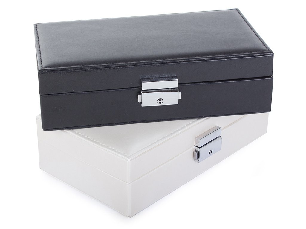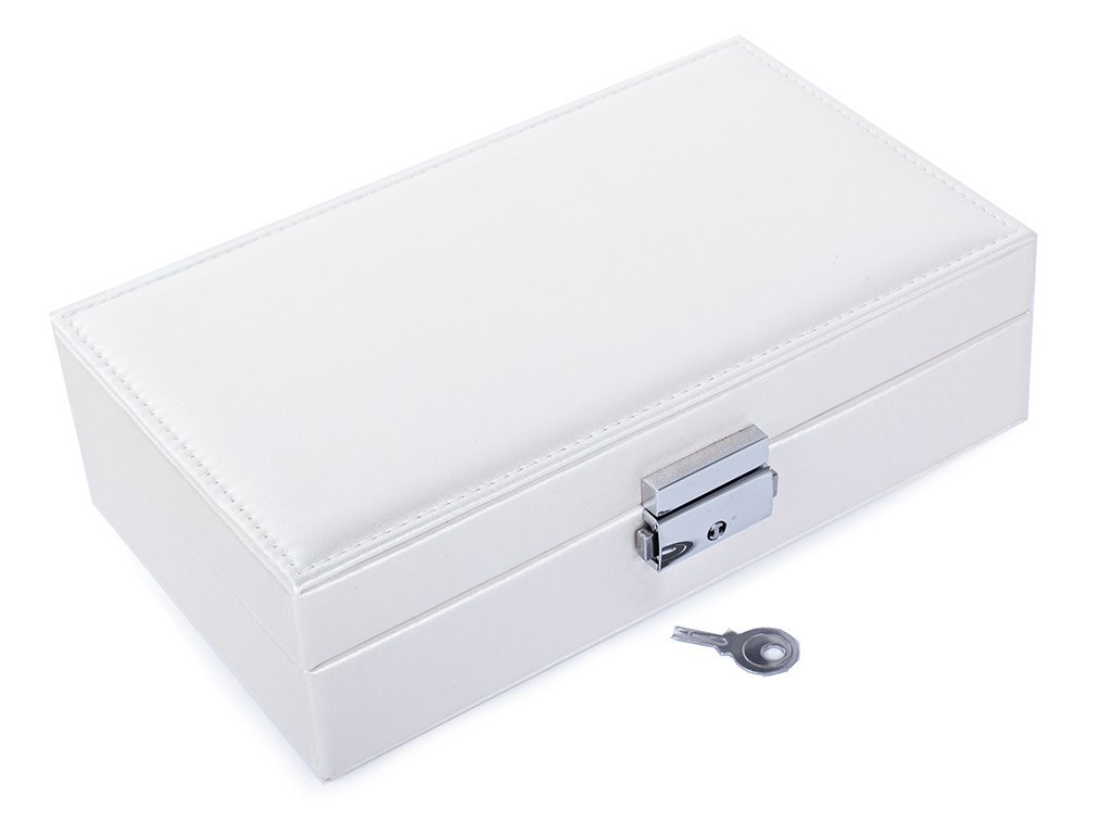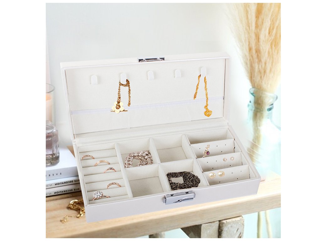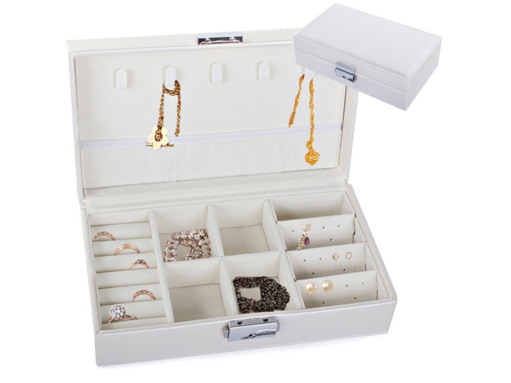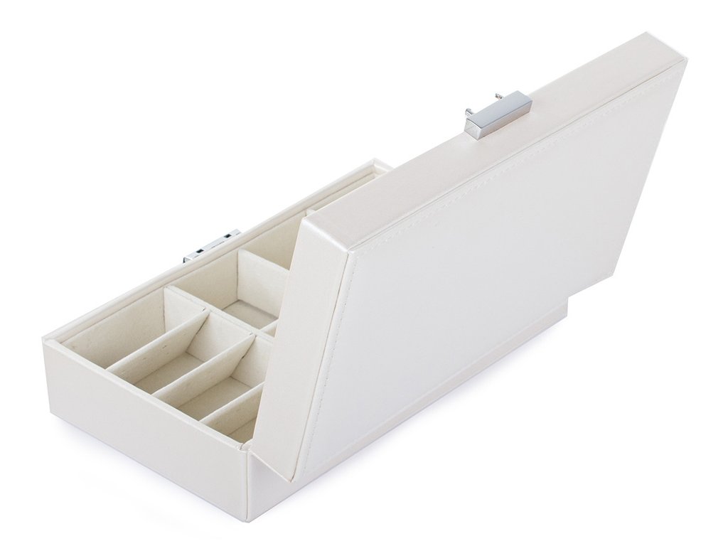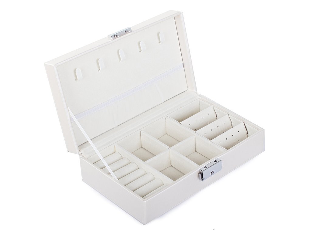 Velká, velmi prostorná schránka pro uspořádání všech typů šperků a hodinek. Organizér je vybaven různými typy a velikostmi přihrádek , které úspěšně pojmou velké množství prstenů, řetízků, náušnic, náramků atd.