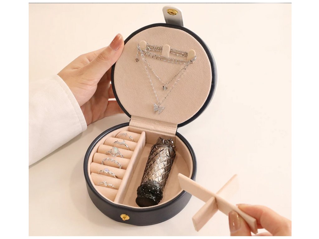 Skříňka se skládá z mnoha funkčních prvků. Po otevření v ní najdeme ramínka na náušnice, zrcátko, přihrádky na prsteny a další šperky.