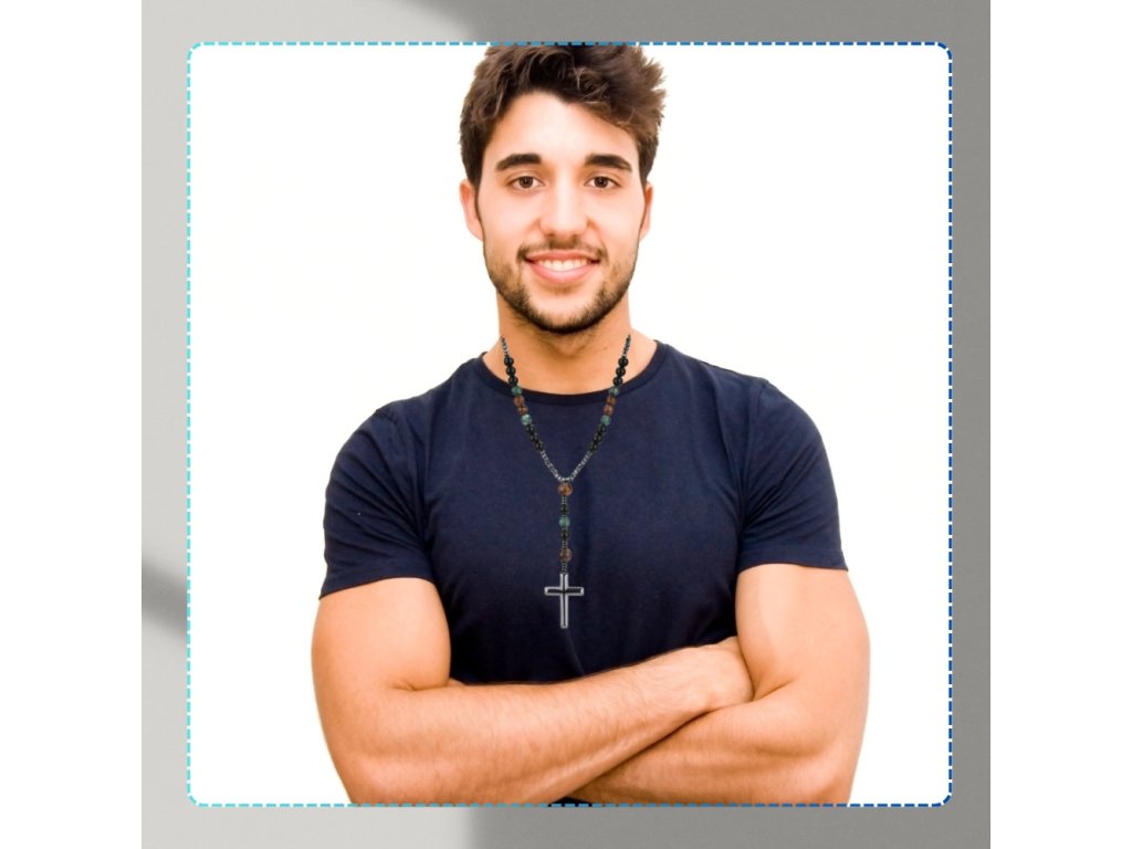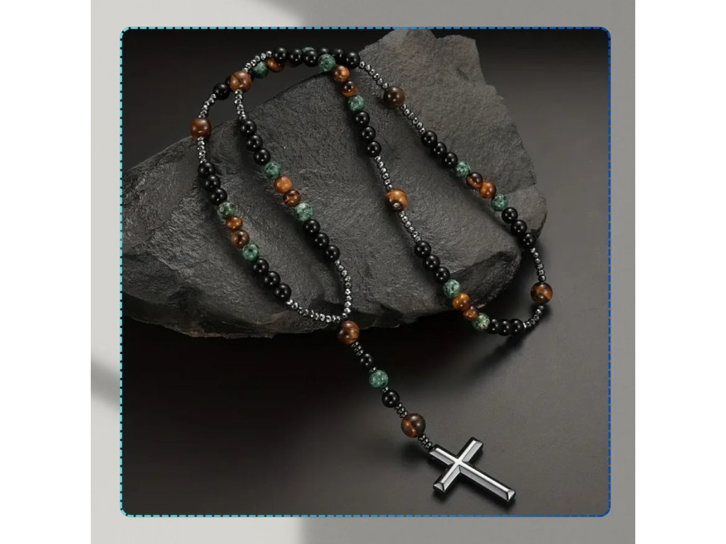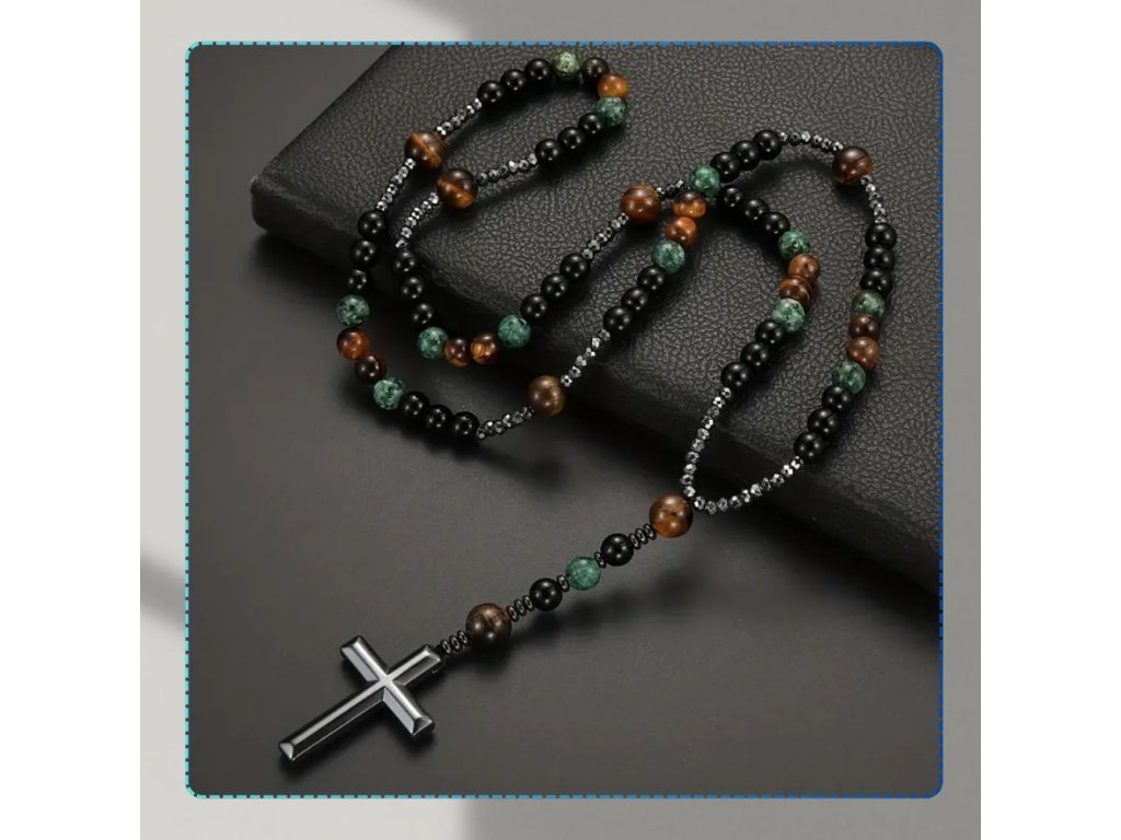 s mužským a ženským růžencem s křížkem, vyrobeným z přírodních kamenů. Tento jedinečný černý růženec kombinuje eleganci s duchovní silou, co ho činí ideálním jak na každodenní nošení, tak na speciální události. Korálky z přírodních kamenů, jako je tygří oko, hematit a další přírodní materiály, dodávají tomuto náhrdelníku charakter a jedinečný styl. Korálky v černé, hnědé a zelené barvě vytvářejí harmonickou kompozici, která přitahuje pohled a skvěle ladí s každým oblečením.