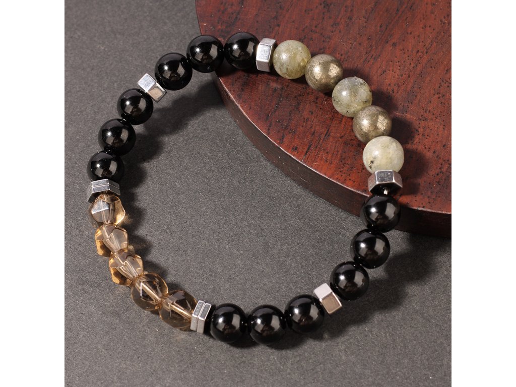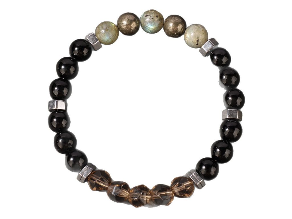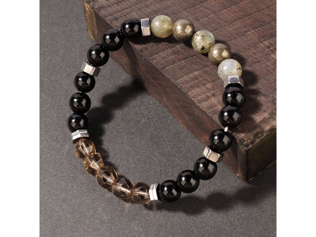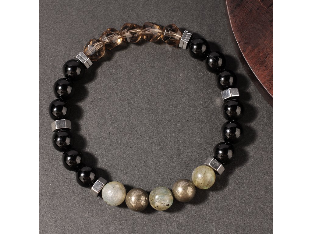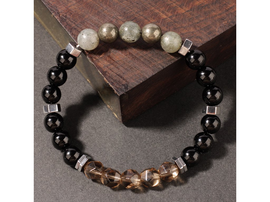 Exkluzivní pánský náramek z přírodního pyritu, labradoritu a broušeného kouřového křišťálu. Ručně vyráběný šperk od Srdcem darované navržený pro ochranu, odvahu a vnitřní klid moderního muže.