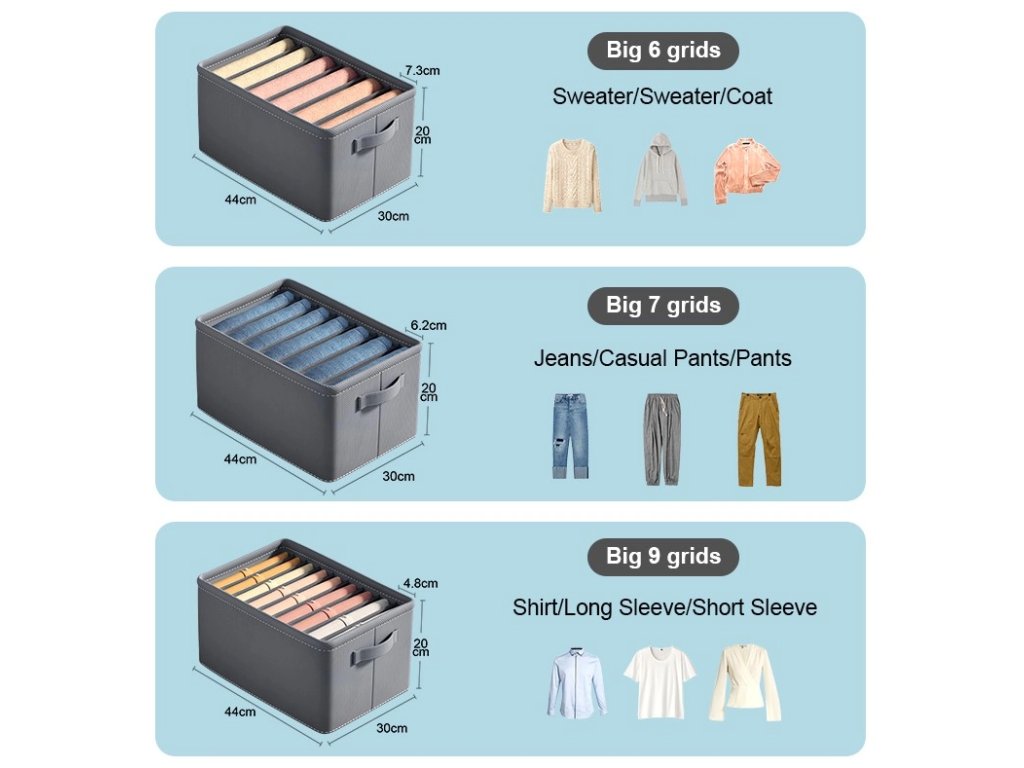 Jedná se o velmi funkční produkt s rozměry 44 x 30 x 20 cm. Jeho šedá barva dodává elegantní vzhled, který se snadno hodí do jakékoliv šatní skříně. Organizér má dno na zip, což usnadňuje jeho skládání a ukládání, když ho právě nepotřebujete.