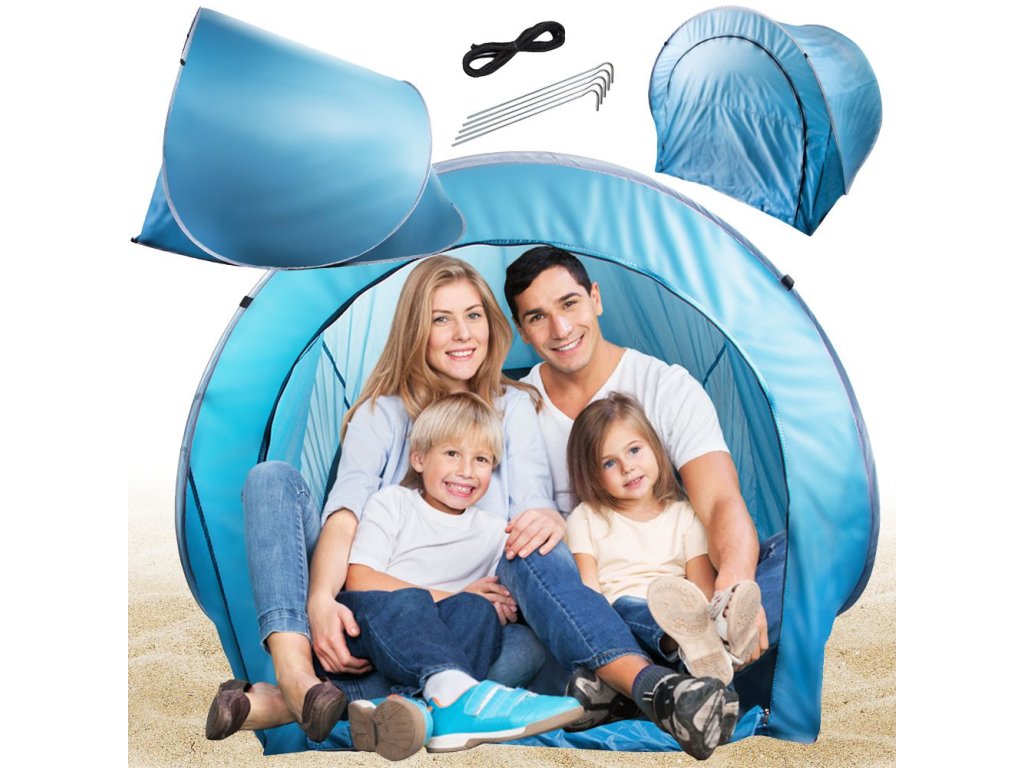 Tento velký, samorozkládací plážový stan Pop-Up se zipem poskytuje ochranu, pohodlí a soukromí během několika sekund. Je vyroben z odolného materiálu, snadno se přenáší a obsahuje obal, kolíky a šňůry pro upevnění.