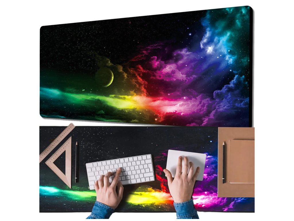 Tato podložka s motivem vesmírné galaxie je perfektní pro každého, kdo hledá maximální pohodlí, stabilitu a efektivitu. Využijte obrovský prostor pro myš i klávesnici, vytvořte si jednotný a organizovaný povrch a zapomeňte na klouzání nebo nechtěné absorbování tekutin. Její unikátní potisk okamžitě dodá vaší stanici jedinečný, poutavý charakter a zajistí, že se stanete hvězdou každého herního či pracovního maratonu.