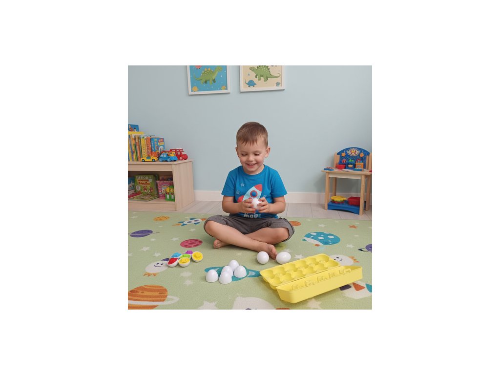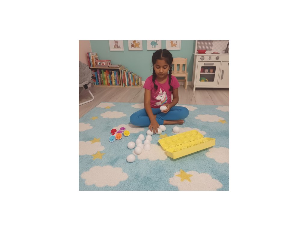 vzdělávací hračka – sada obsahuje 12 vajíček různých tvarů a barev, která dítě spojuje do dvojic, rozvíjí tak fantazii, pozorování a paměť