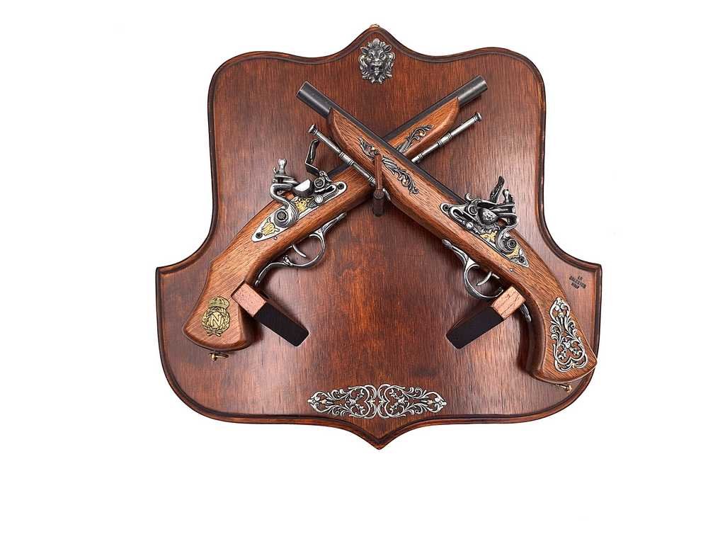 Elegantní replika dvou historických pistolí na dřevěném závěsu TR-237 přináší do vašeho interiéru jedinečný nádech mužnosti a stylu. Každý detail těchto pečlivě zpracovaných replik je vytvořen s vášní pro historii a umělecké zpracování, díky čemuž se stává nejen dekorativním prvkem, ale také zajímavým sběratelským kouskem. Výjimečná ornamentika dodává celému dílu jedinečný charakter a zaručuje, že zaujme každého, kdo má slabost pro historické zbraně.