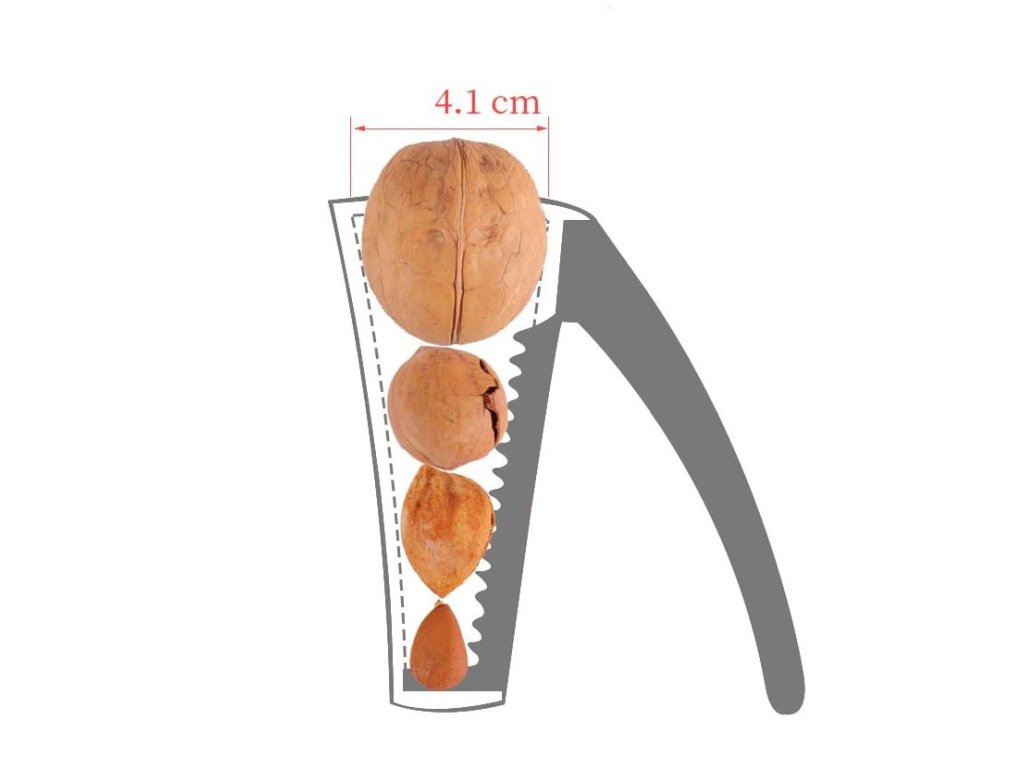 Rozměry tohoto praktického nástroje jsou 11,2 x 5,6 cm. Díky svým kompaktním rozměrům zabere v kuchyňské zásuvce minimálně místa a bude vždy po ruce pro vaše potřeby. Vejdou se do něj nejen malé lískové ořechy, ale i velké vlašské ořechy o maximálním průměru 4,1 cm.