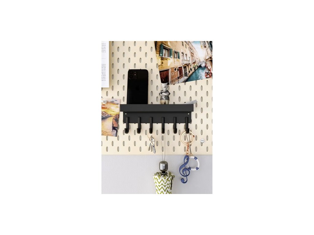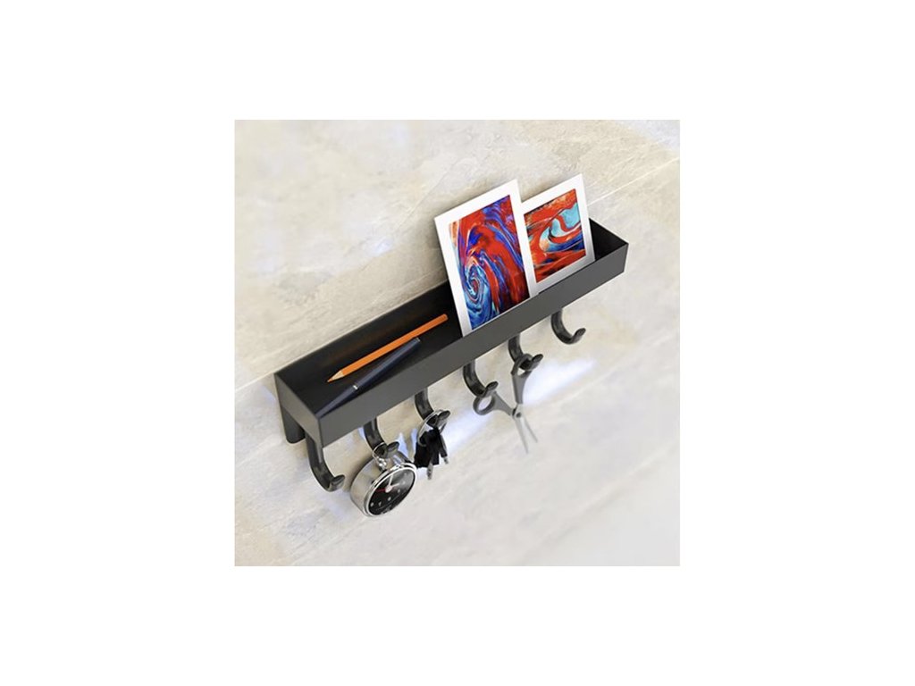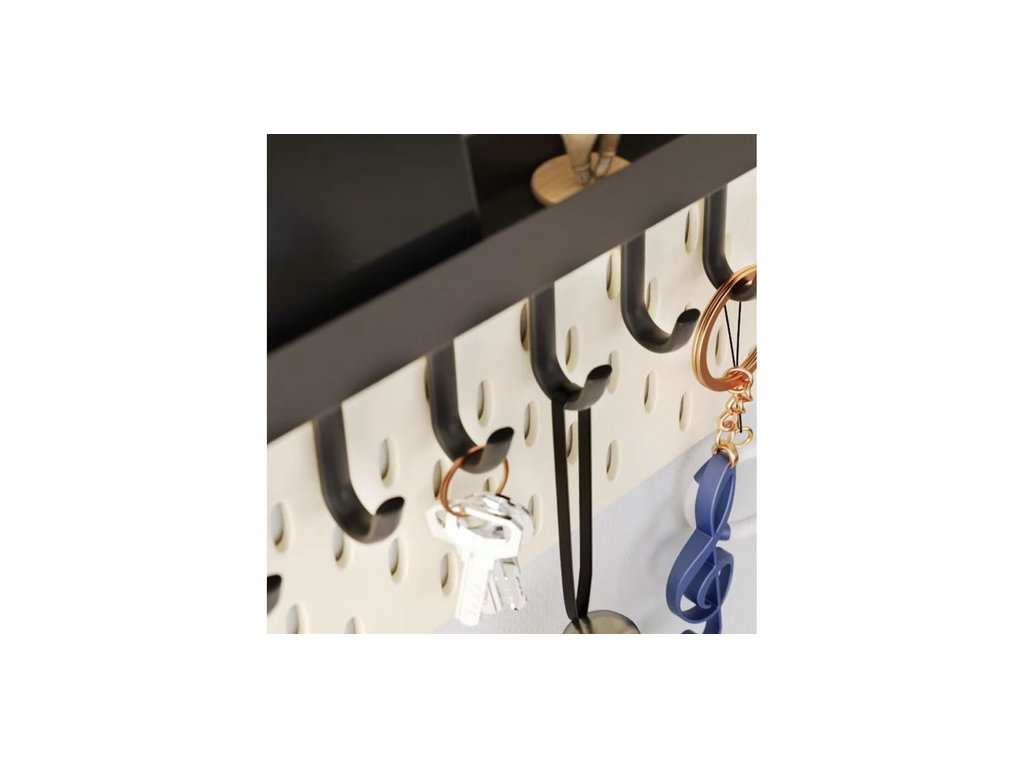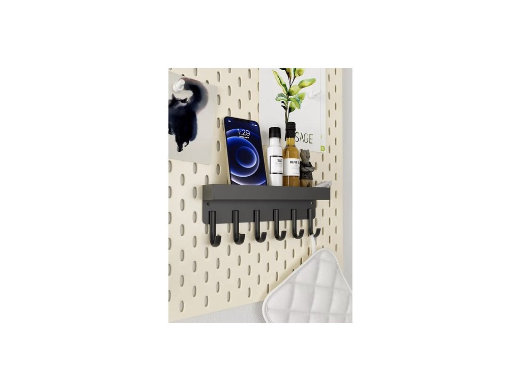 funkčnost - vybavena 6 silnými háčky a policí s 2,3 cm vysokými okraji, která zajišťuje stabilitu uložení oblečení a drobných předmětů jako jsou peněženky, telefony nebo klíče
