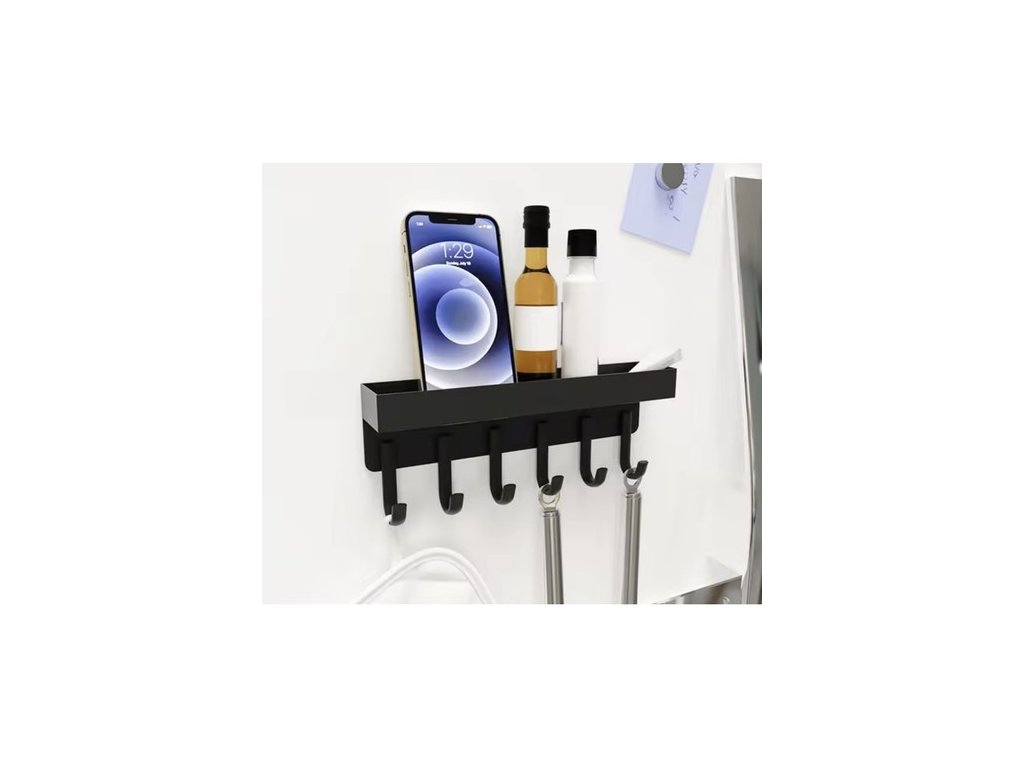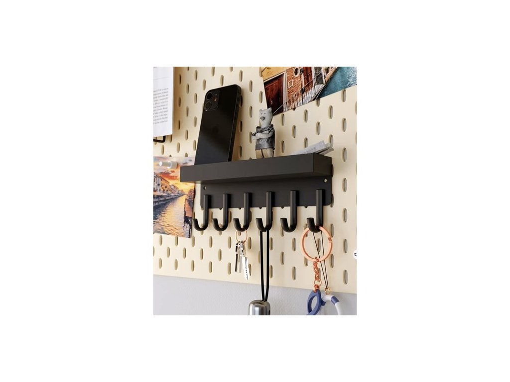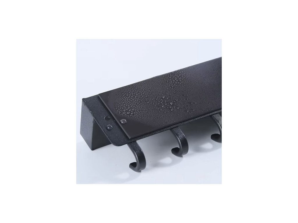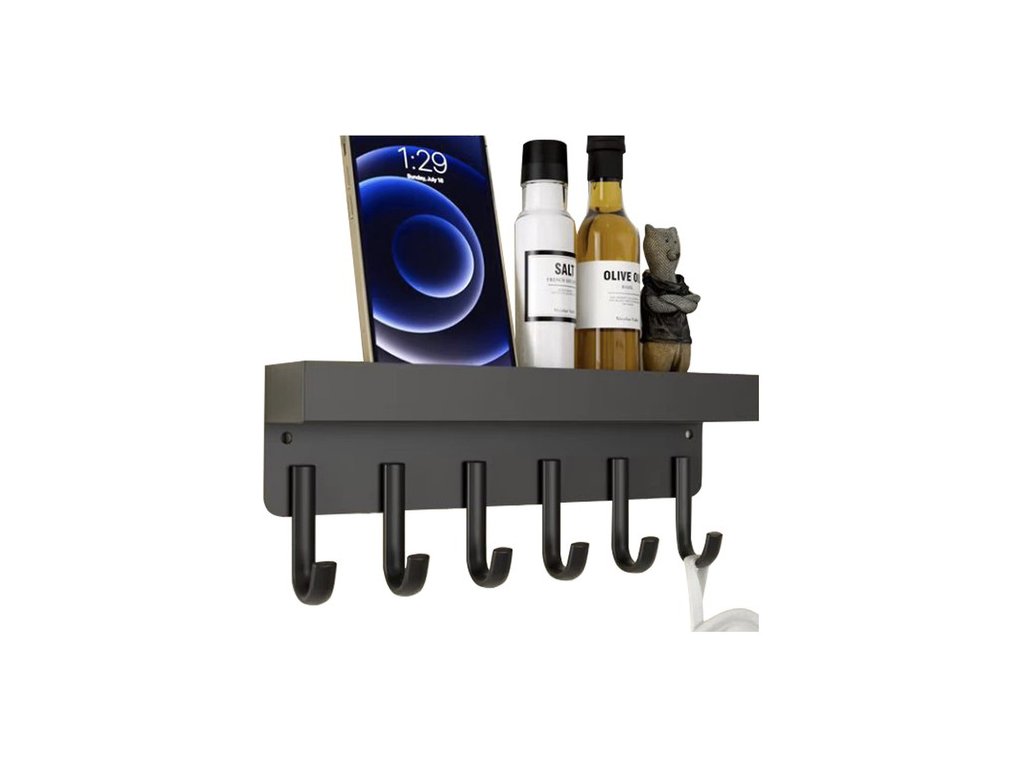 funkčnost - vybavena 6 silnými háčky a policí s 2,3 cm vysokými okraji, která zajišťuje stabilitu uložení oblečení a drobných předmětů jako jsou peněženky, telefony nebo klíče