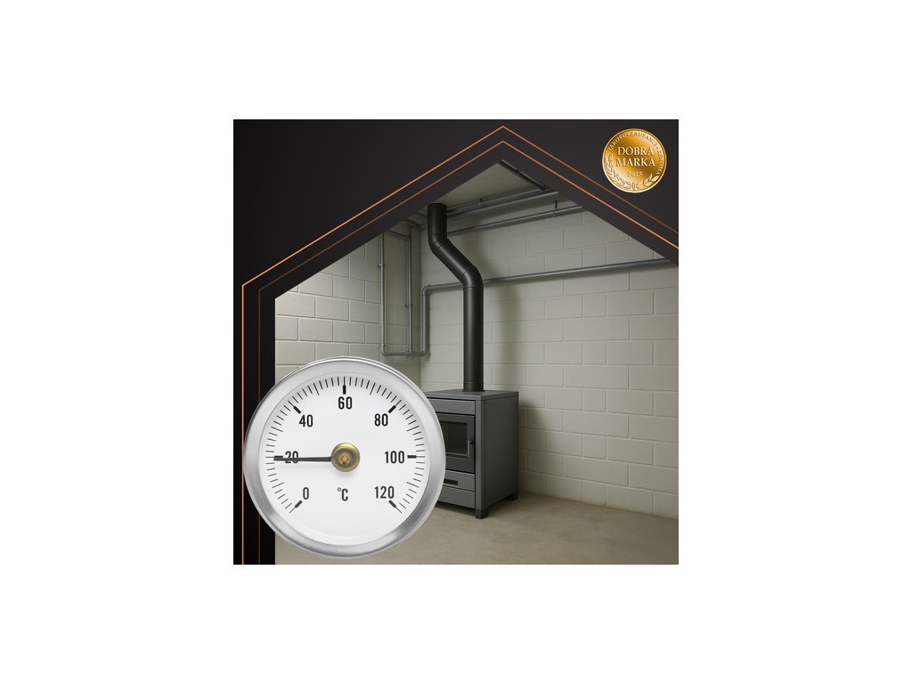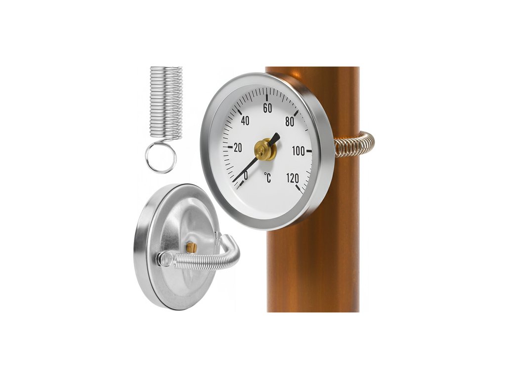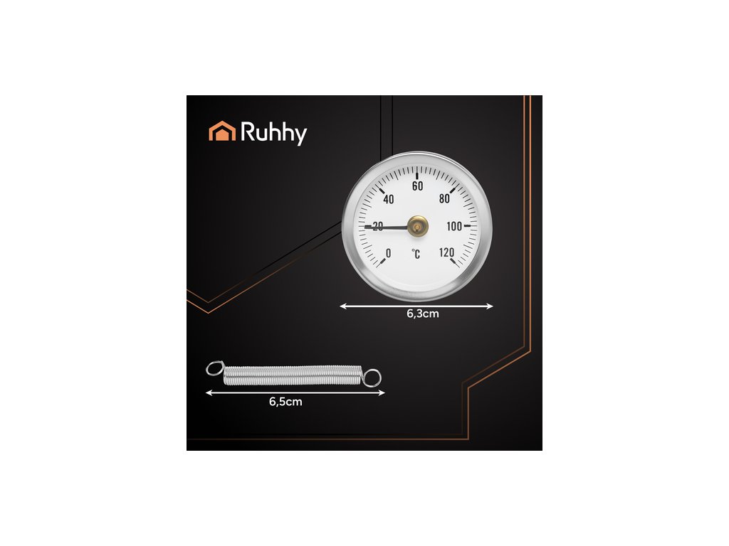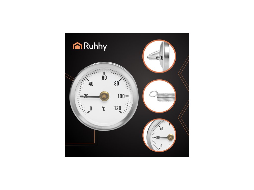 Teploměr RUHHY s ručičkou je kombinací jednoduchosti, přesnosti a funkčnosti. Jasný a čitelný ciferník umožňuje rychlé odečítání teploty v rozsahu od 0 do 120 °C a pevná konstrukce z vysoce kvalitních materiálů zaručuje spolehlivost po mnoho let. Díky montážní pružině lze zařízení snadno připevnit k potrubí, což z něj činí nepostradatelného nástroje v oblasti vytápění, průmyslových a domácích instalací.
