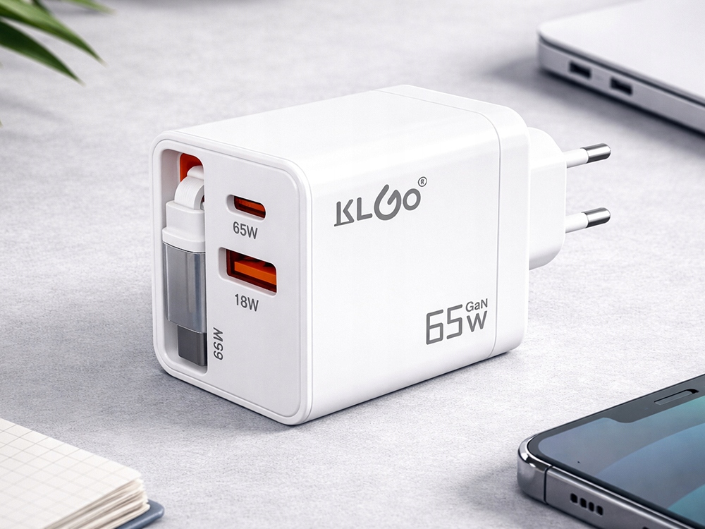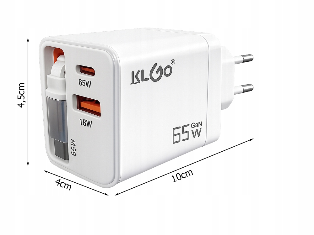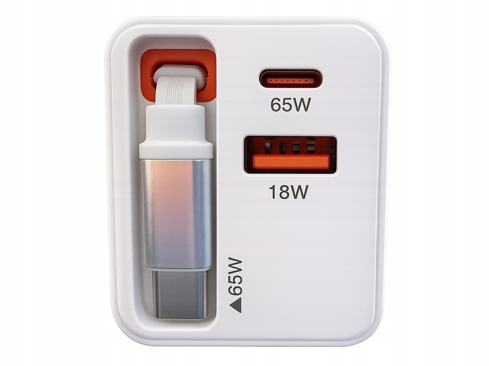 Moderní a výkonná nabíječka 65 W s integrovaným kabelem USB-C a dalšími nabíjecími porty. Ideální pro rychlé nabíjení smartphonů, tabletů, notebooků a dalších mobilních zařízení.