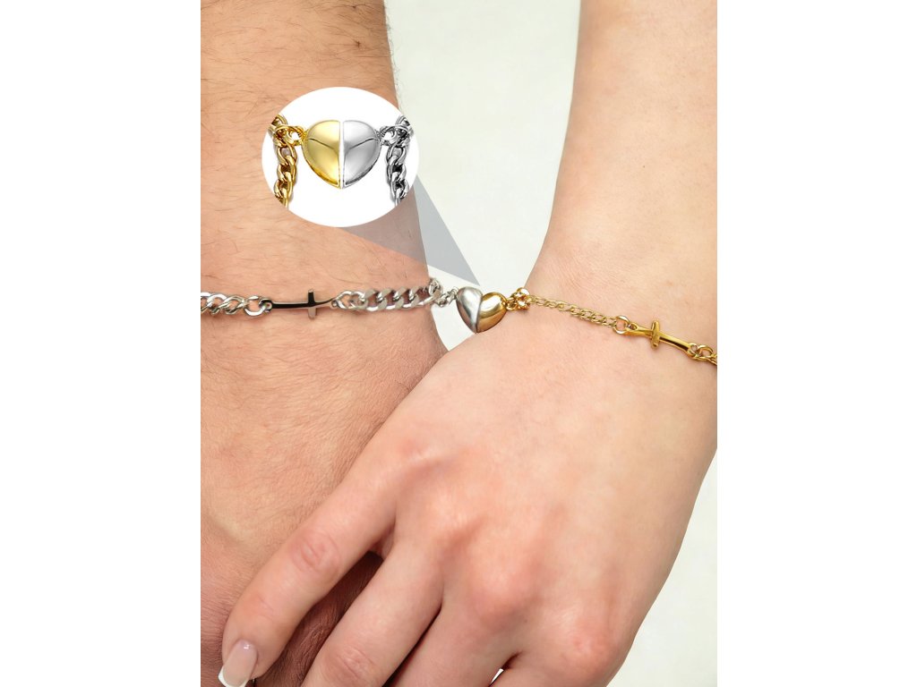 Elegantní sada dvou náramků z chirurgické oceli 304 pro páry. Magnetické srdce symbolizuje vaši vzájemnou přitažlivost. Vysoce odolné 18K pozlacení a klasický Cuban Link design od Srdcem darované.