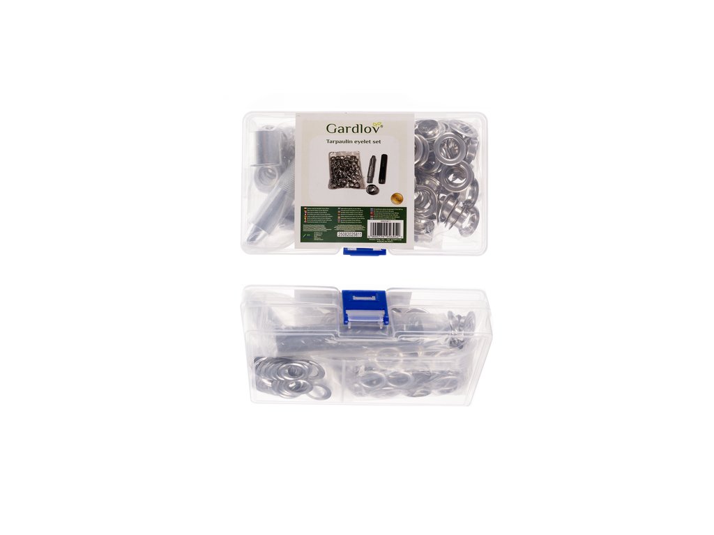 kompletní sada - zakoupíte si kompletní sadu oček na plachtu - 100 ok, 100 podložek, děrovačku, nýtovačku a organizér, vše v jedné krabici, připraveno k použití ihned po vybalení – žádné dodatečné náklady, nedostatky ani běhání po obchodech