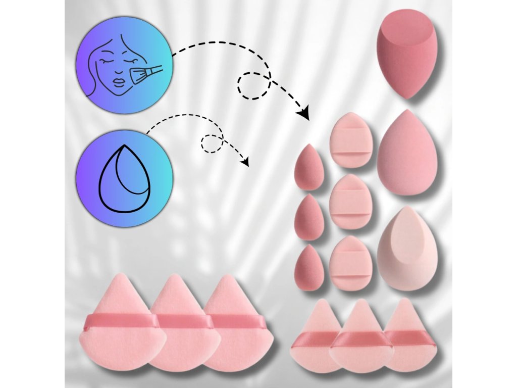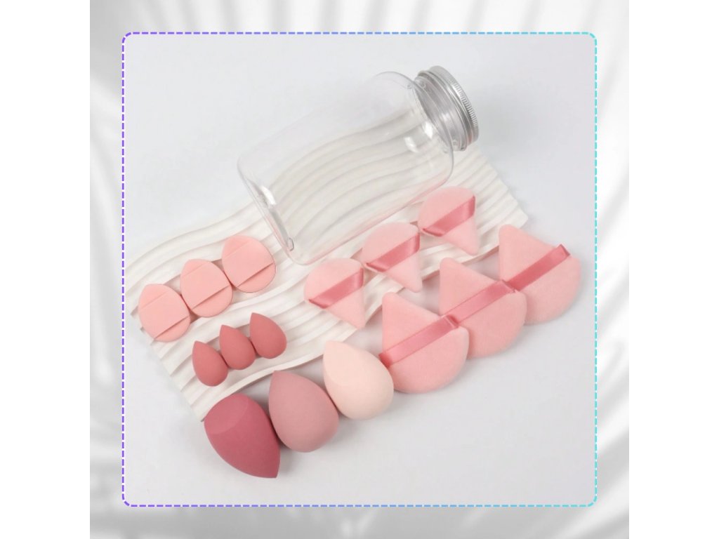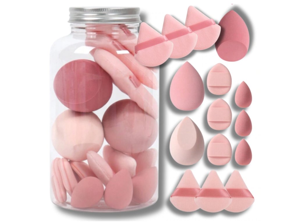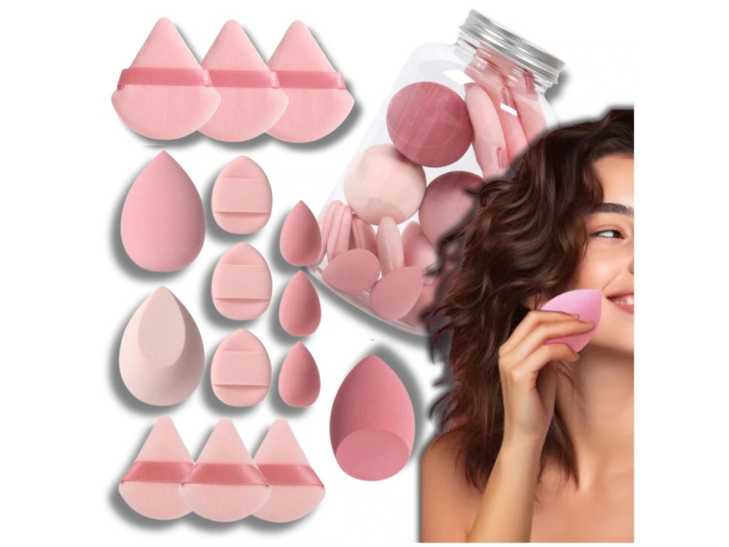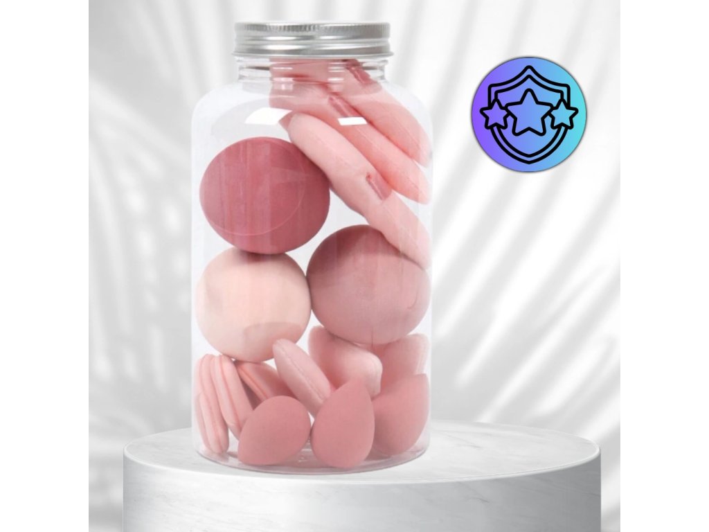 Všechny houbičky jsou vyrobeny z vysoce kvalitního polyuretanu, což zajišťuje jejich odolnost a pružnost. Materiál je ideální k používání na sucho i na mokro, takže snadno přizpůsobíte způsob aplikace svým preferencím a typu produktu. Růžová barva houbiček jim dodává půvab, a sklenice, ve které jsou uloženy, zajišťuje pohodlí a hygienu použití. Sklenice je dokonalá pro skladování houbiček, chrání je před zašpiněním a zachovává jejich dlouhodobou čerstvost.