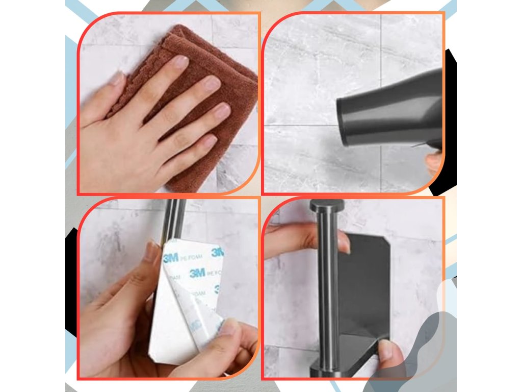 Držák se snadno instaluje pomocí speciální montážní pásky, takže není třeba vrtat otvory do stěny. Po odstranění ochranné fólie stačí držák přitisknout na stěnu a podržet jej tam několik sekund. Držák lze použít 24 hodin po instalaci a jeho umístění lze snadno změnit podle potřeby.