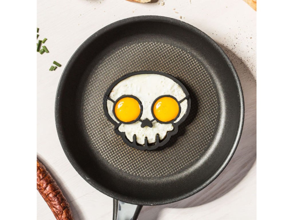 Překvapte své děti skvělou snídaní v podobě vaječných lebek. Silikonová forma na vajíčka ve tvaru lebky vytvoří na pánvi z rozklepnutého vejce veselou lebku, kterou můžete ozdobit zeleninou a podávat dětem jako snídani. Děti si Vaše snídaně rychle oblíbí a budou se na ně těšit. Volská oka z kvalitní silikonové formy ve tvaru lebky se stanou populární v celé rodině. Silikonové formy na vajíčka - lebka jsou originální dárek do kuchyně.