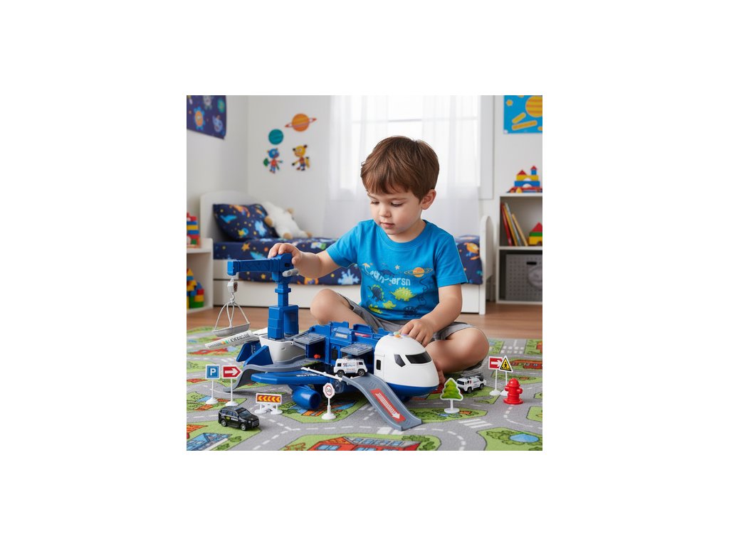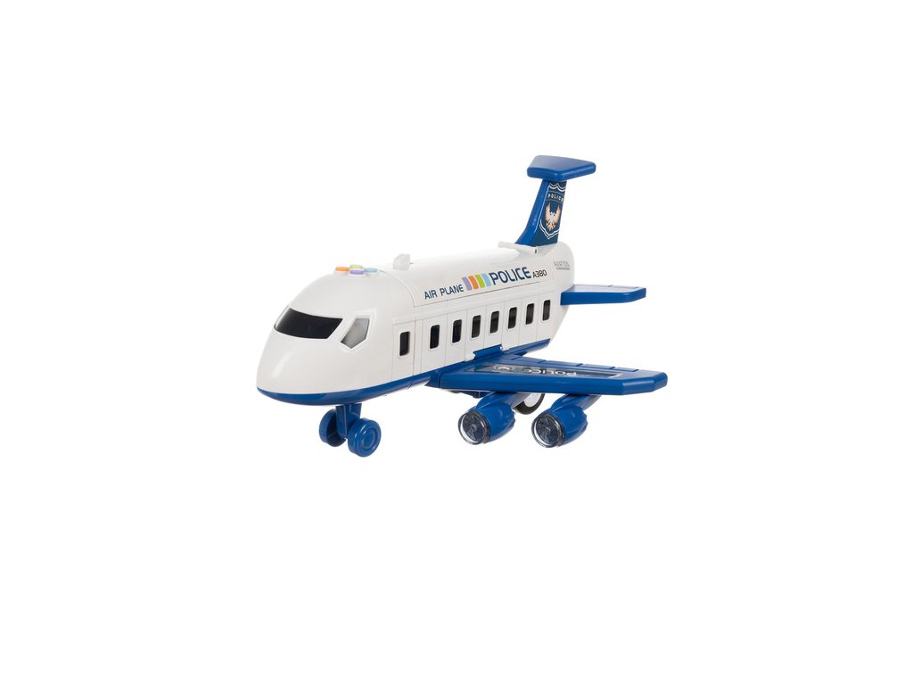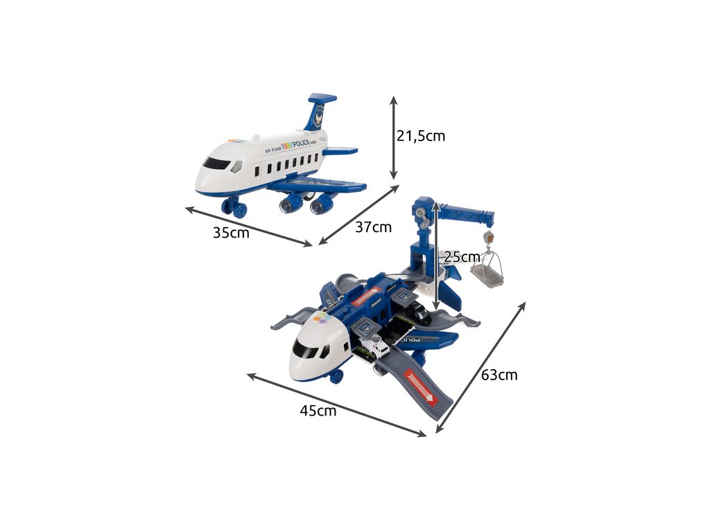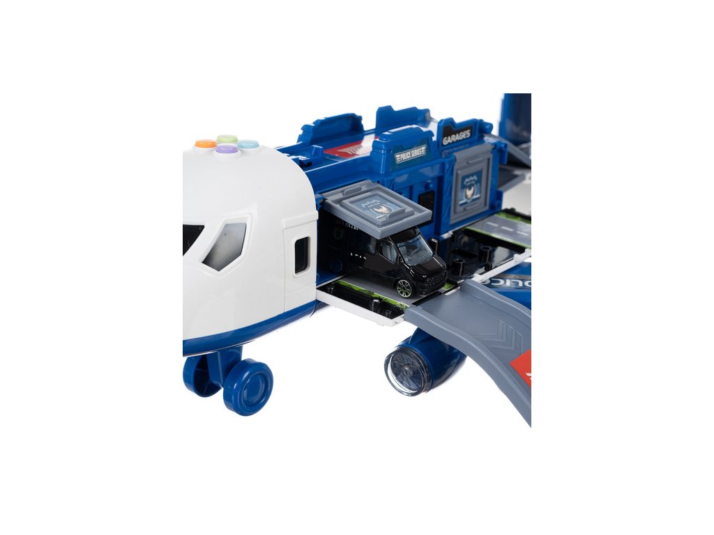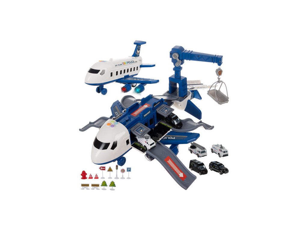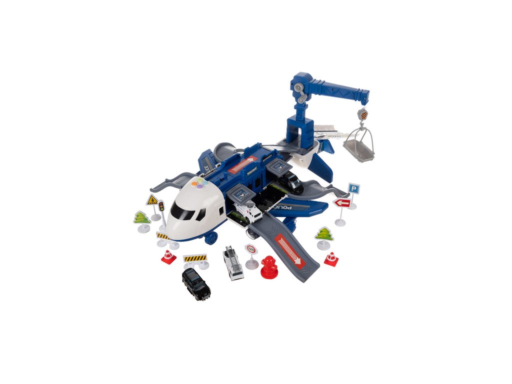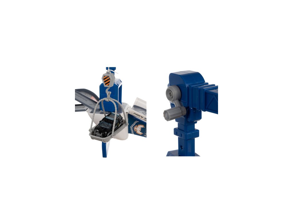 policejní letadlo s pohyblivými částmi – sada obsahuje velký letadlo s otevíracími boky, rampa, odpalovací zařízení pro auta a otočný jeřáb , které hře dodávají realismus a zpestřují každý akční scénář