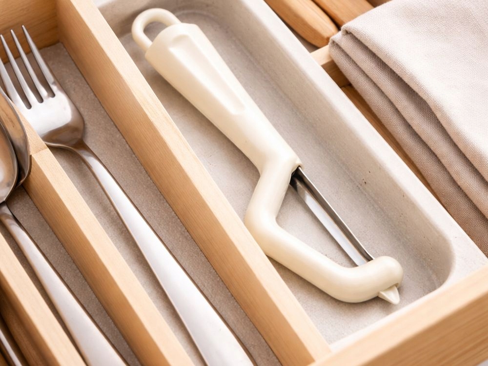 Škrabka zabírá velmi málo místa a snadno se vejde do každé zásuvky. Díky malým rozměrům se pohodlně skladuje. Je to praktické řešení do každé kuchyně.