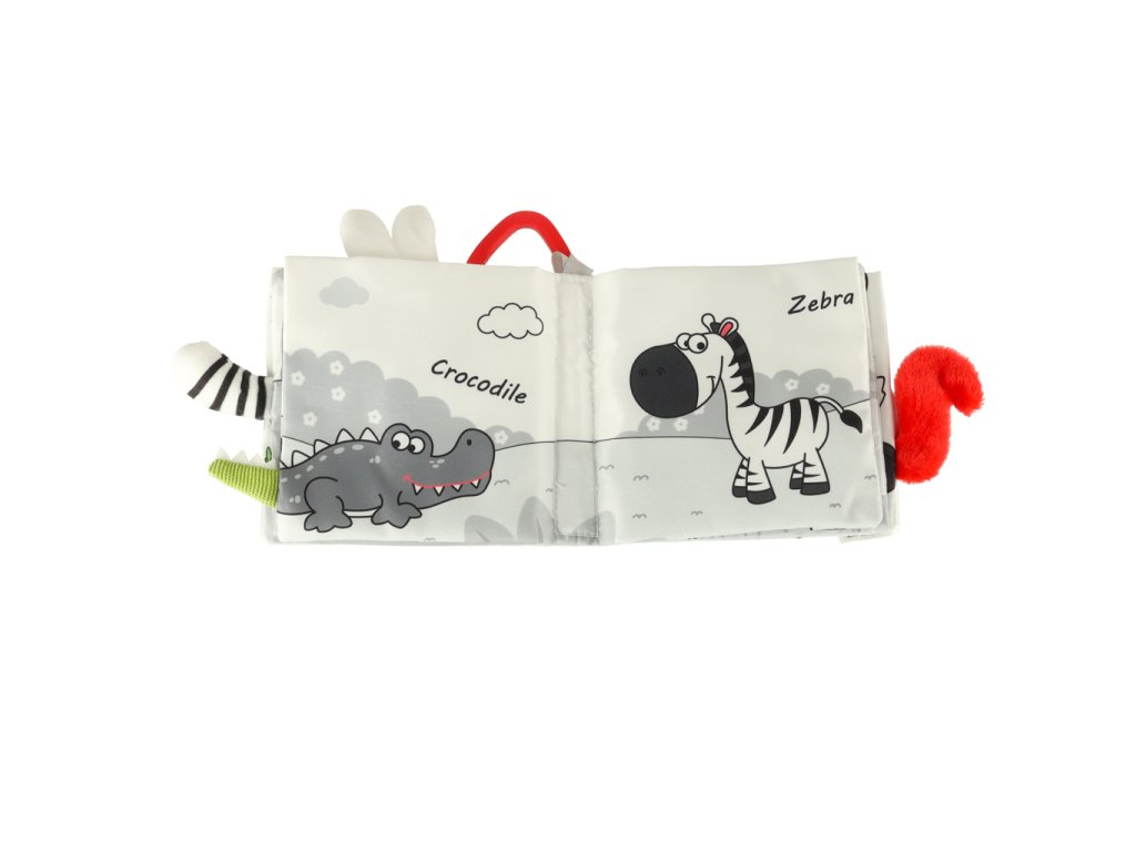 Super sensoryční knížka. Skládá se ze 4 látkových stránek, které zobrazují různá zvířata. Šustící stránky a kontrastní vzory přitáhnou pozornost každého malého dítěte. Materiál: polyester + plyš. Rozměry knížky: 14x12,5x2 cm.