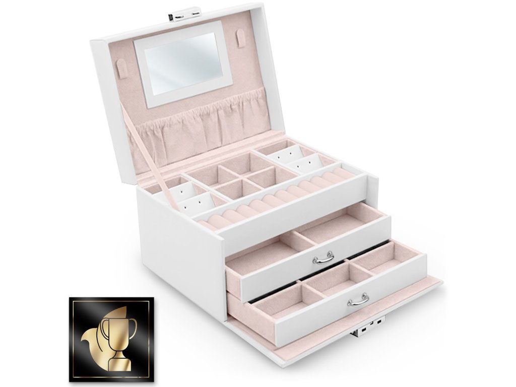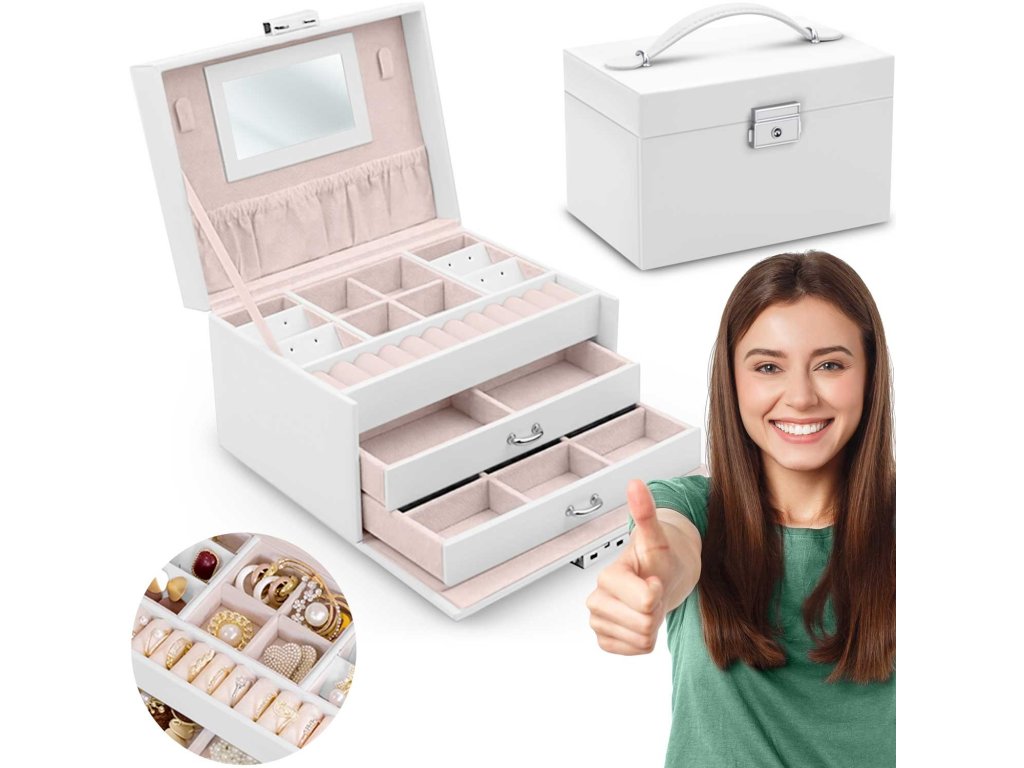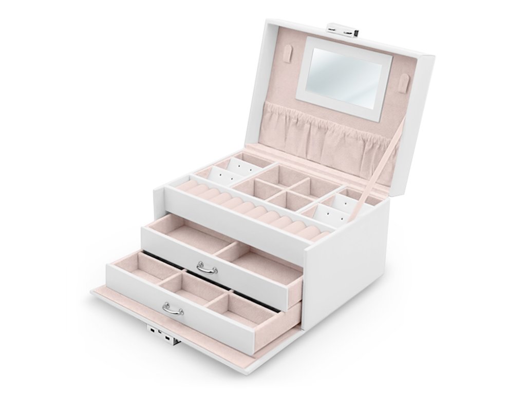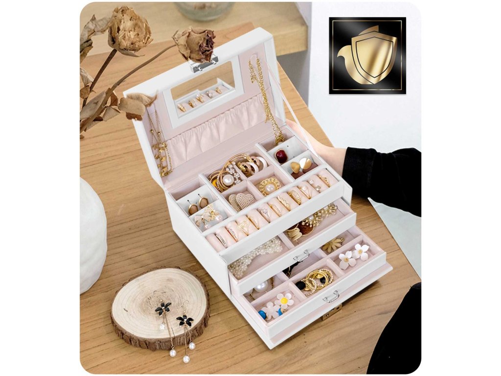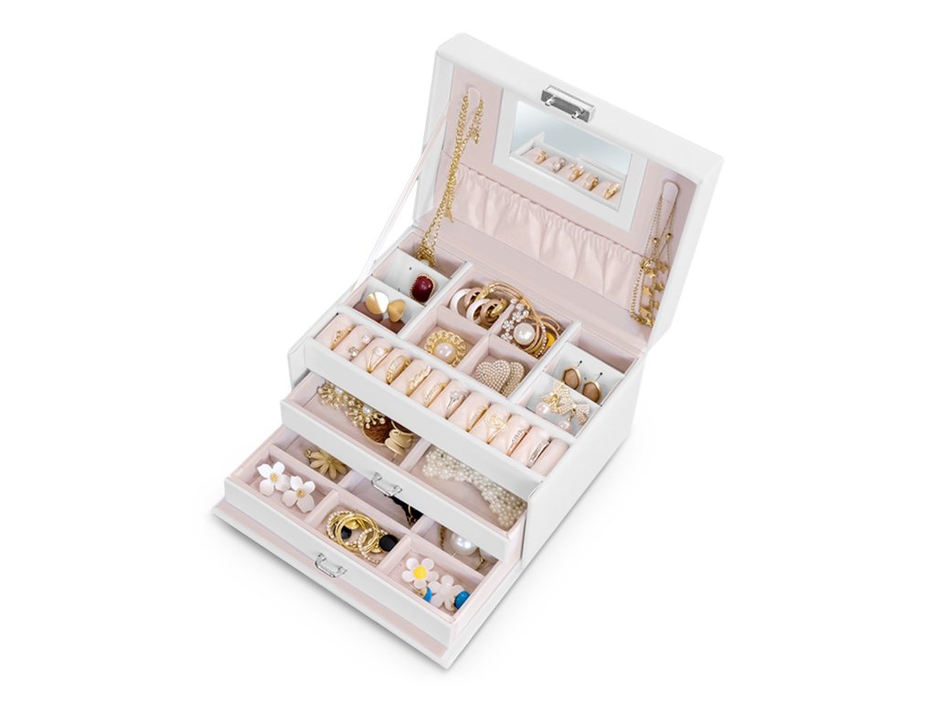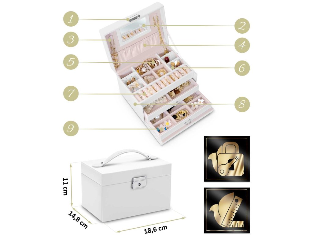 Naše šperkovnice je více než jen úložný prostor – je to prostor pro vaše vzpomínky, krásné chvíle a jedinečné poklady, které chcete mít vždy na dosah. S rukojetí pro snadné přenášení a funkcí uzamčení, která zabraňuje náhodnému otevření, se stanete majitelkou nejen krásného, ale i praktického kousku. Vydobijte si každý centimetr prostoru, který potřebujete!