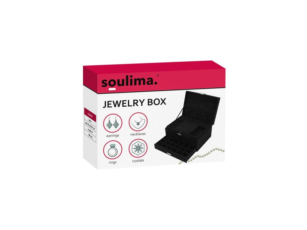 - SPECIFIKACE – materiál: semiš; konstrukce: MDF deska, netkaná textilie; ostatní: papír, karton, pěna, nylon; kovové prvky; barva: černá; 8 závěsů na řetěz; 15 míst pro kroužky; 6 úzkých přihrádek; 1 kapsa s gumičkou; 18 míst pro náušnice; 9 přihrádek na přívěsky; 6 velkých přihrádek; 18 zásuvných přihrádek; 1 dlouhá přihrádka na hodinky; rozměry uzavřeného pouzdra (délka/šířka/výška): 11,5 x 24,5 x 17,5 cm; hmotnost: 0,94 kg. Hmotnost balení: 1,168 kg.