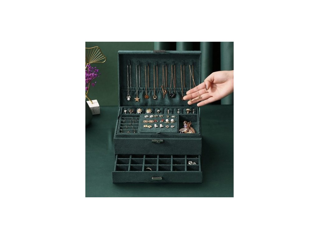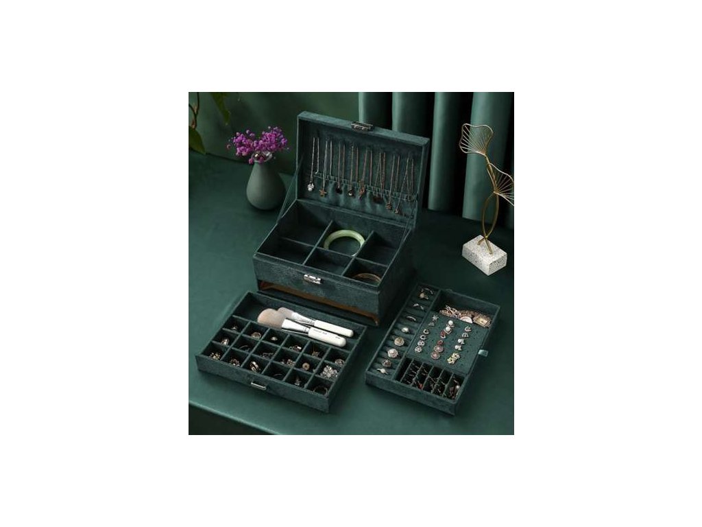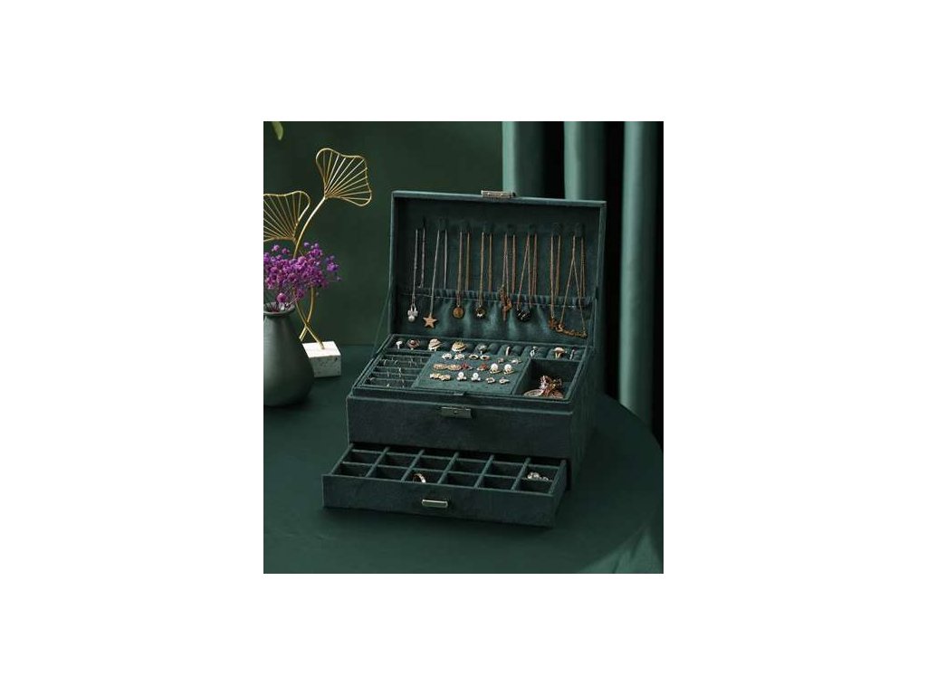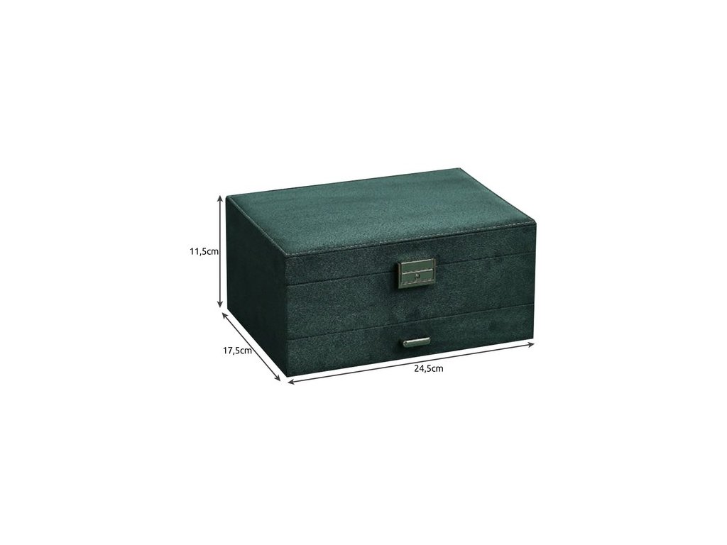 - SPECIFIKACE – materiál: semiš, konstrukce – MDF deska, netkaná textilie, ostatní: papír, karton, molitan, nylon, kovové prvky; barva: odstíny zelené; 8 řetízkových závěsů; 15 kruhových slotů; 6 úzkých přihrádek; 1 kapsa s elastickým páskem; 18 míst pro náušnice; 9 přihrádek na přívěsky; 6 velkých přihrádek; 18 přihrádek v zásuvce; 1 podlouhlá přihrádka na hodinky; rozměry uzavřeného pouzdra (délka/šířka/výška): 11,5 x 24,5 x 18 cm; hmotnost: 1,081 kg. hmotnost balíku: 1,314 kg.