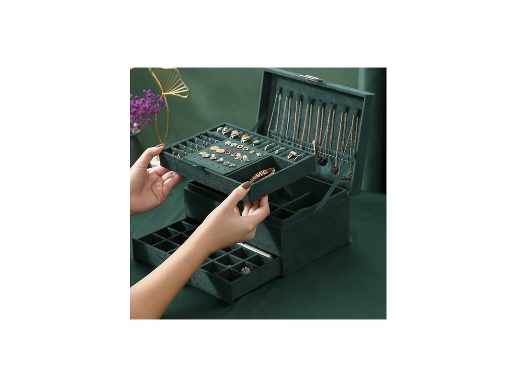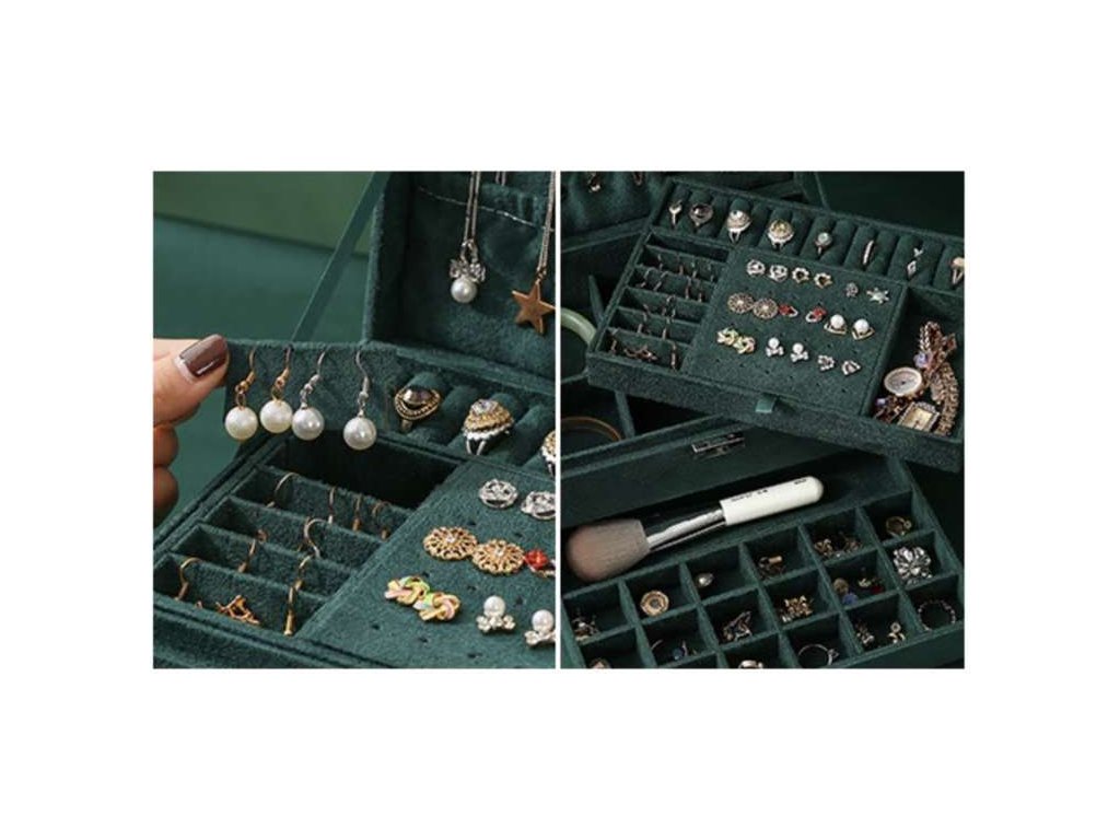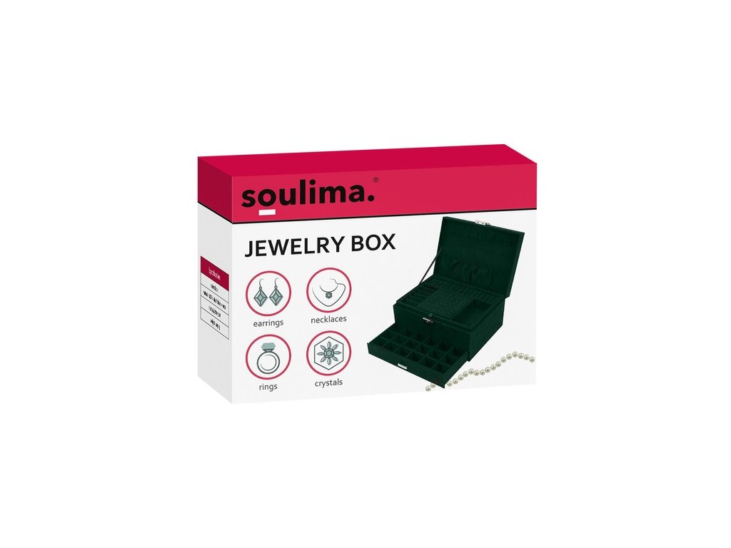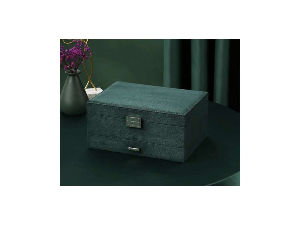 - SPECIFIKACE – materiál: semiš, konstrukce – MDF deska, netkaná textilie, ostatní: papír, karton, molitan, nylon, kovové prvky; barva: odstíny zelené; 8 řetízkových závěsů; 15 kruhových slotů; 6 úzkých přihrádek; 1 kapsa s elastickým páskem; 18 míst pro náušnice; 9 přihrádek na přívěsky; 6 velkých přihrádek; 18 přihrádek v zásuvce; 1 podlouhlá přihrádka na hodinky; rozměry uzavřeného pouzdra (délka/šířka/výška): 11,5 x 24,5 x 18 cm; hmotnost: 1,081 kg. hmotnost balíku: 1,314 kg.