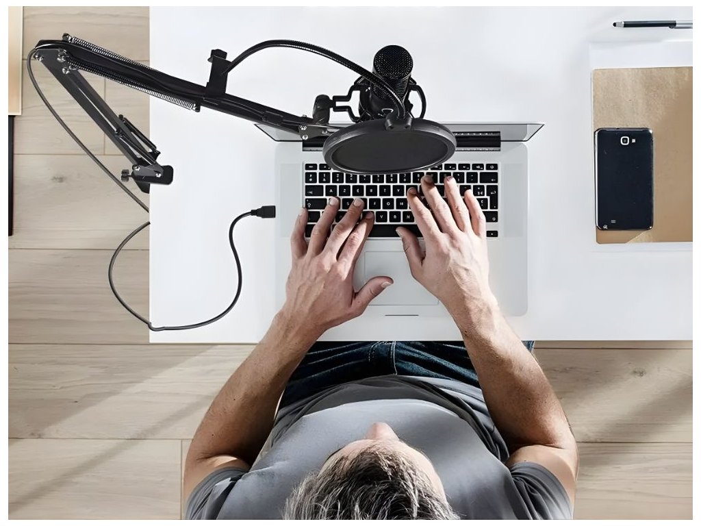 Součástí sady je nastavitelný stolní stativ s pružinovým ramenem, který umožňuje přesné nastavení mikrofonu do pohodlné polohy. Antivibrační držák (košík) minimalizuje vibrace a pop filtr a protivětrná houba účinně redukují šum, dech a explozivní souhlásky (např. „P“, „B“). Mikrofon je ideální pro domácí nahrávací studio, online hovory, živé vysílání, podcasty nebo hraní s přáteli.