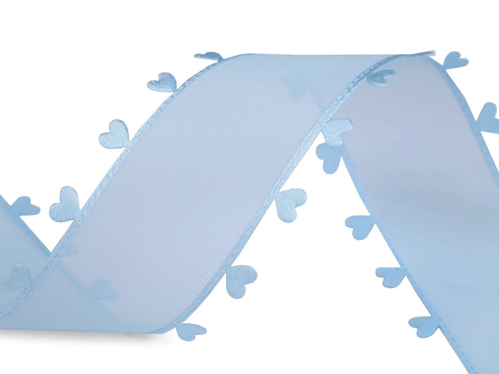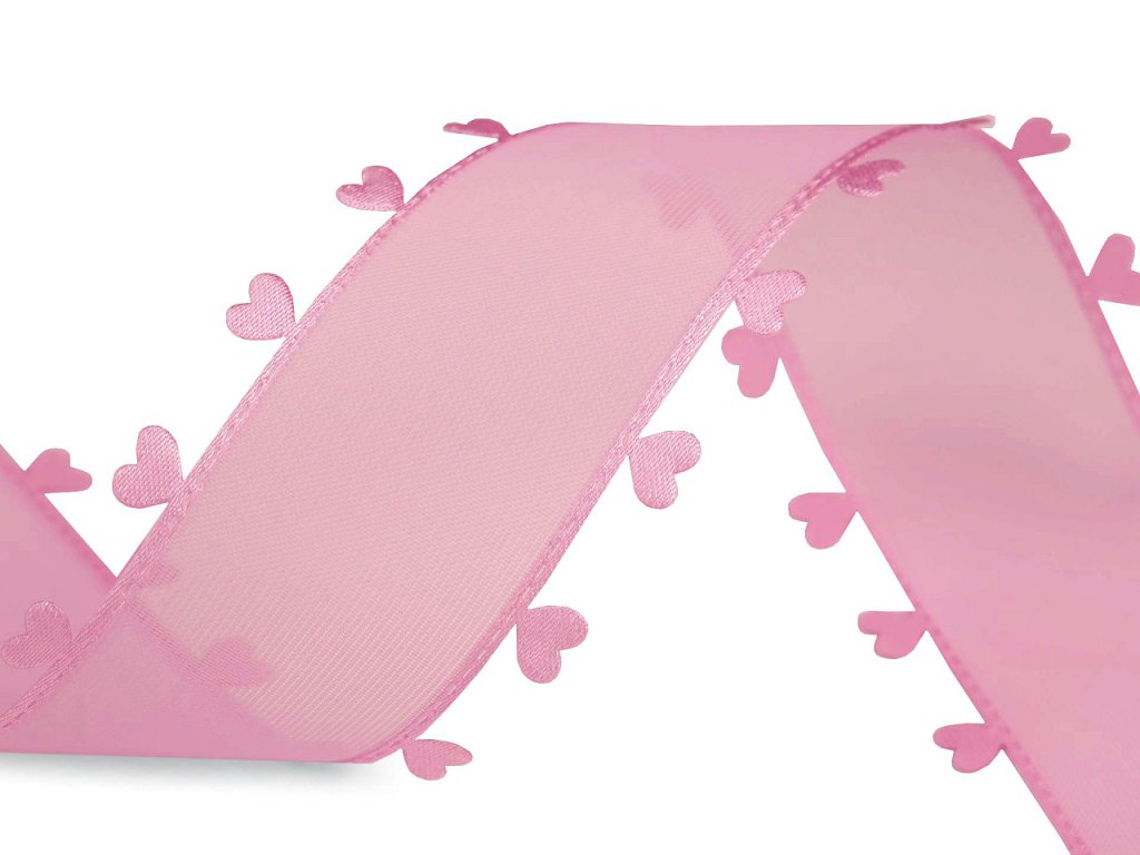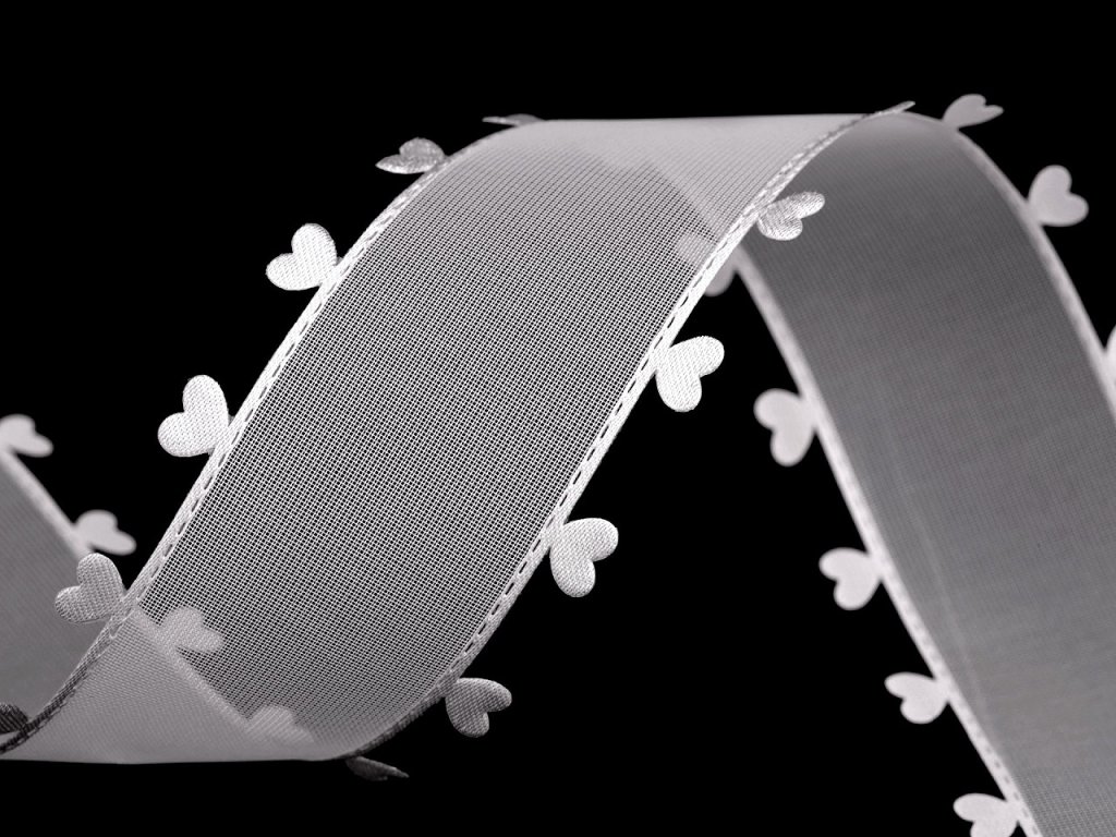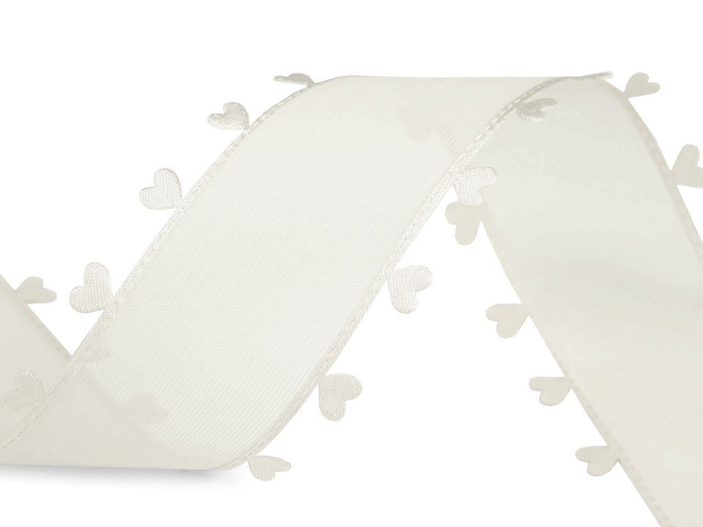 Jemně průsvitnou stuhu se srdíčky zdobí vysekávané vzory, které jsou vzhledem k technologii výroby precizní a rovnoměrné. Je jednostranná s jemným saténovým leskem.
