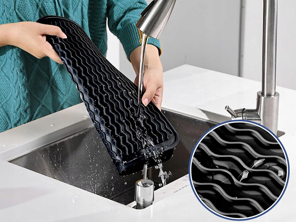 Silikonový odkapávač je skvělou alternativou ke klasickým sušákům na nádobí. Chrání pracovní desku před vodou, skvrnami a škrábanci a zároveň zajišťuje hygienické sušení talířů, hrníčků nebo příborů. Voda volně stéká mezi drážkami, což zabraňuje jejímu hromadění a vzniku nepříjemných pachů.