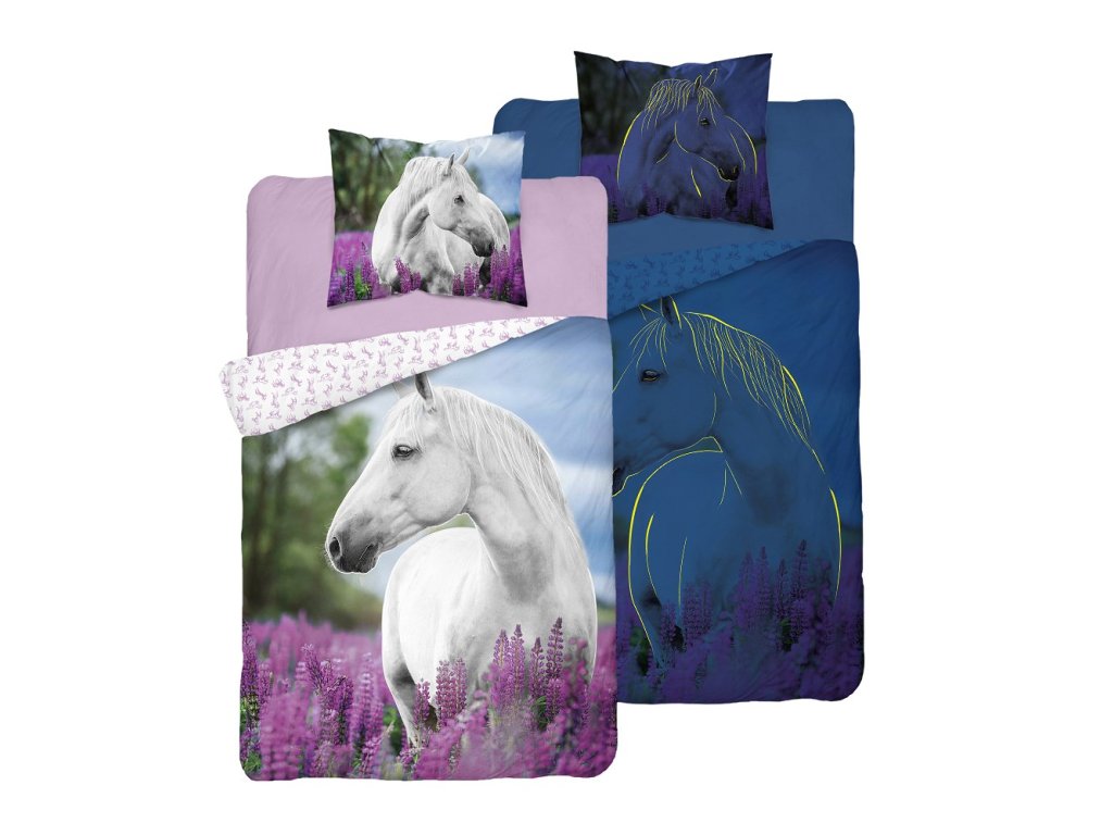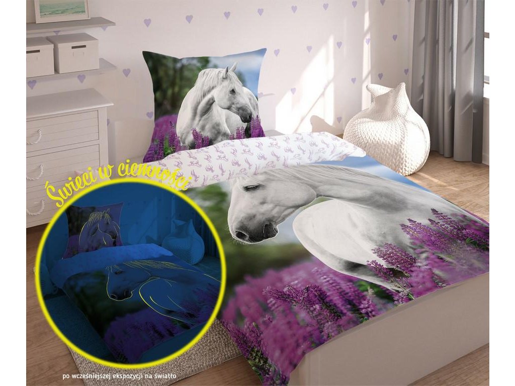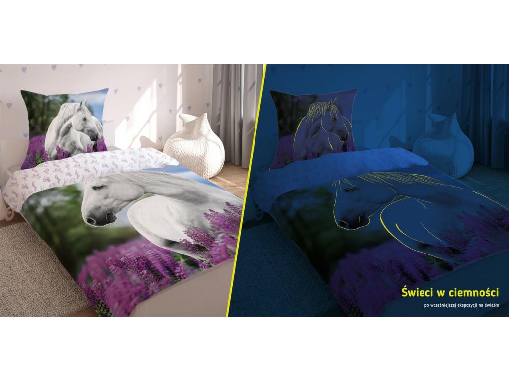 Svítící ve tmě ložní prádlo, Ložní prádlo se skládá z: - přikrývka 140x200±3cm - 1 ks. - povlak na polštář 70x80±3cm - 1 ks. Povlak na peřinu a polštář se zapíná na zip. Hmotnost: 125g/m2, Materiál: 100% bavlna