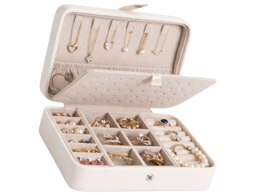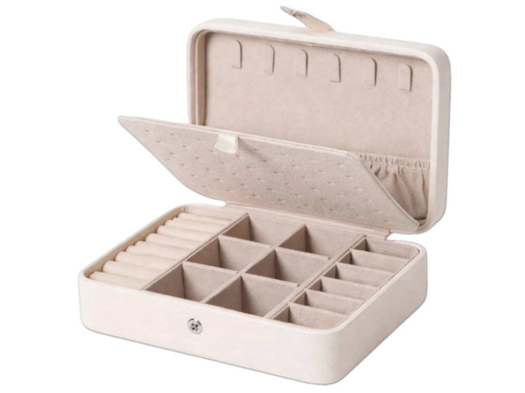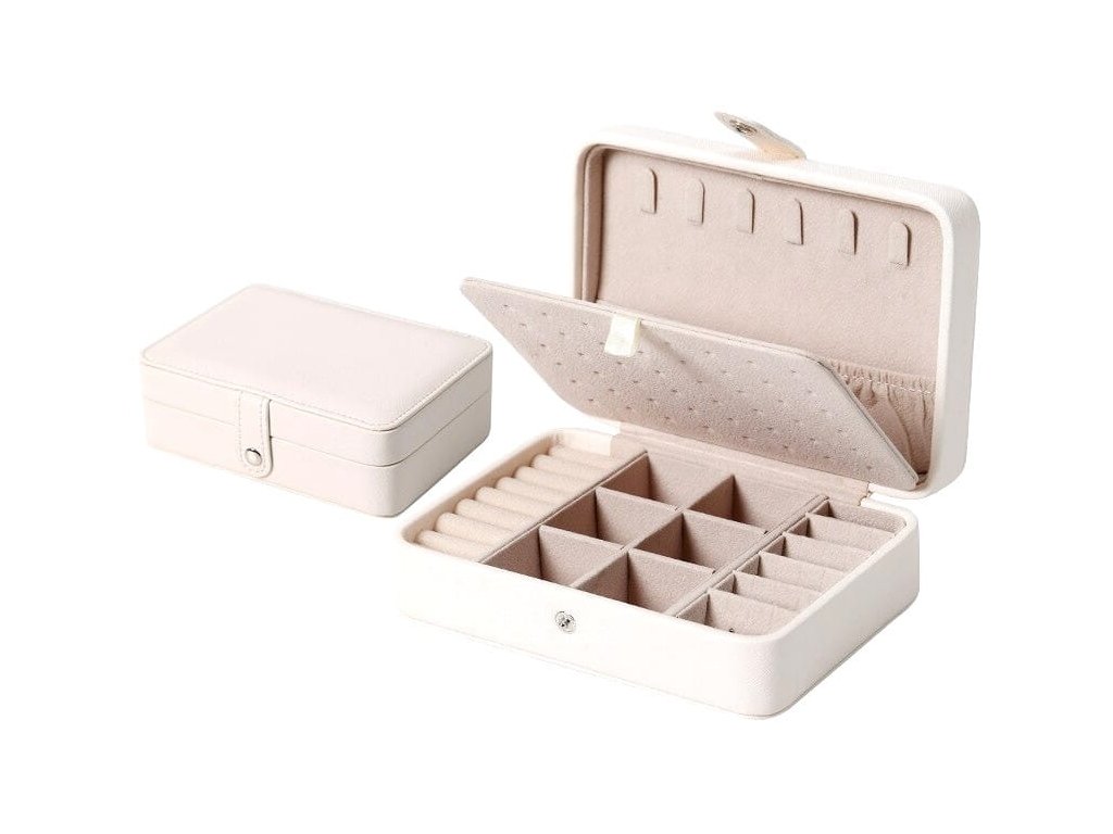 Malý organizér na šperky je nezbytným doplňkem pro všechny milovníky módních doplňků. Jeho kompaktní design a promyšlené rozložení poskytují dokonalou kombinaci elegance a funkčnosti. Uložte své oblíbené šperky s důvěrou a stylem, a nechte je vždy po ruce, ať už doma nebo na cestách. S tímto organizérem už nikdy nebudete mít problém s nepořádkem mezi svými šperky.