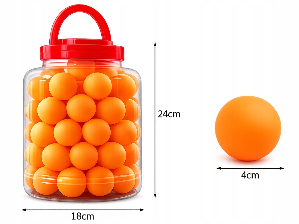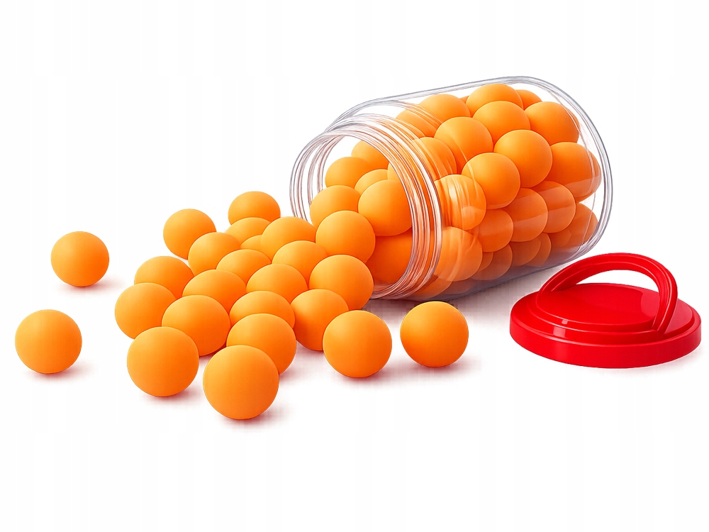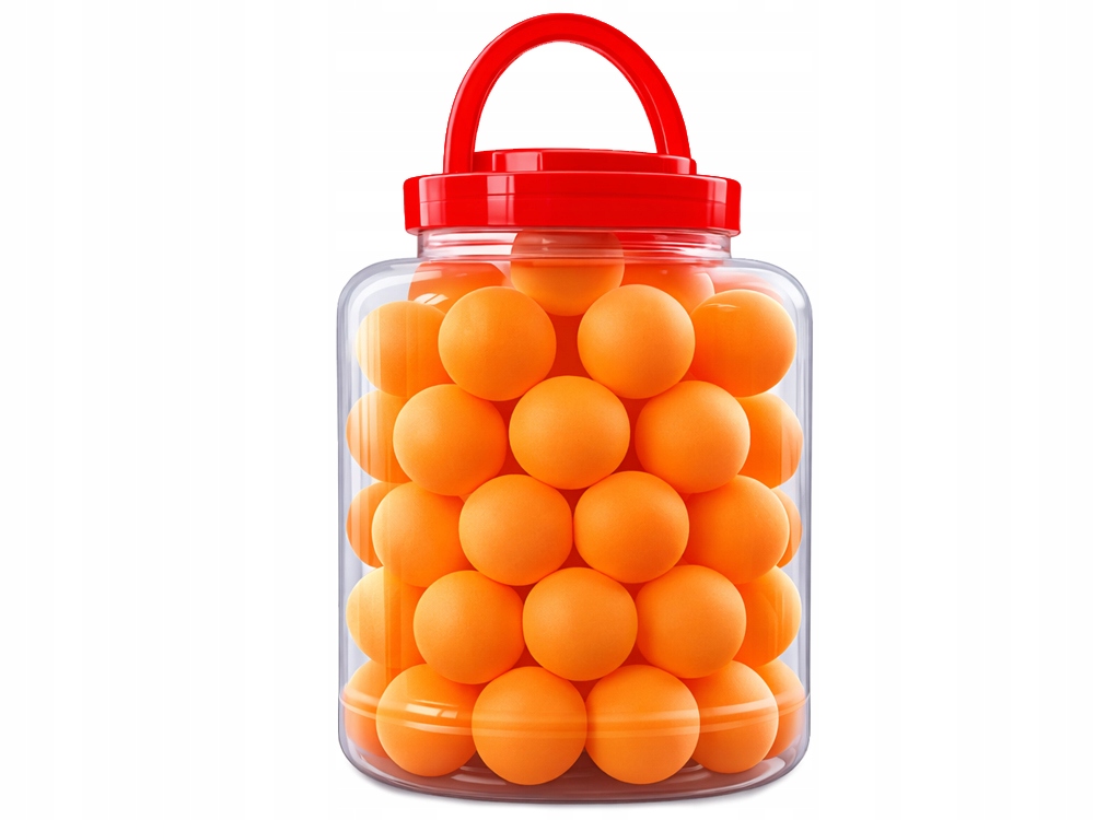 Sada obsahuje 60 oranžových míčků, balených v pevném průhledném kontejneru s pohodlným držadlem.