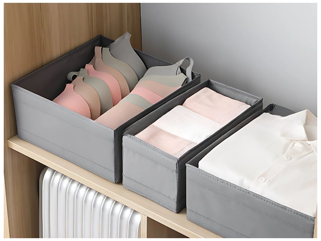 Organizér byl navržen pro efektivní správu prostoru ve skříni. Umožňuje oddělit různé kusy oblečení, což usnadňuje rychlé nalezení potřebných věcí a udržení pořádku. Je ideální pro použití v zásuvkách, na policích nebo ve skříni, kde poskytuje lepší organizaci a estetické uložení.