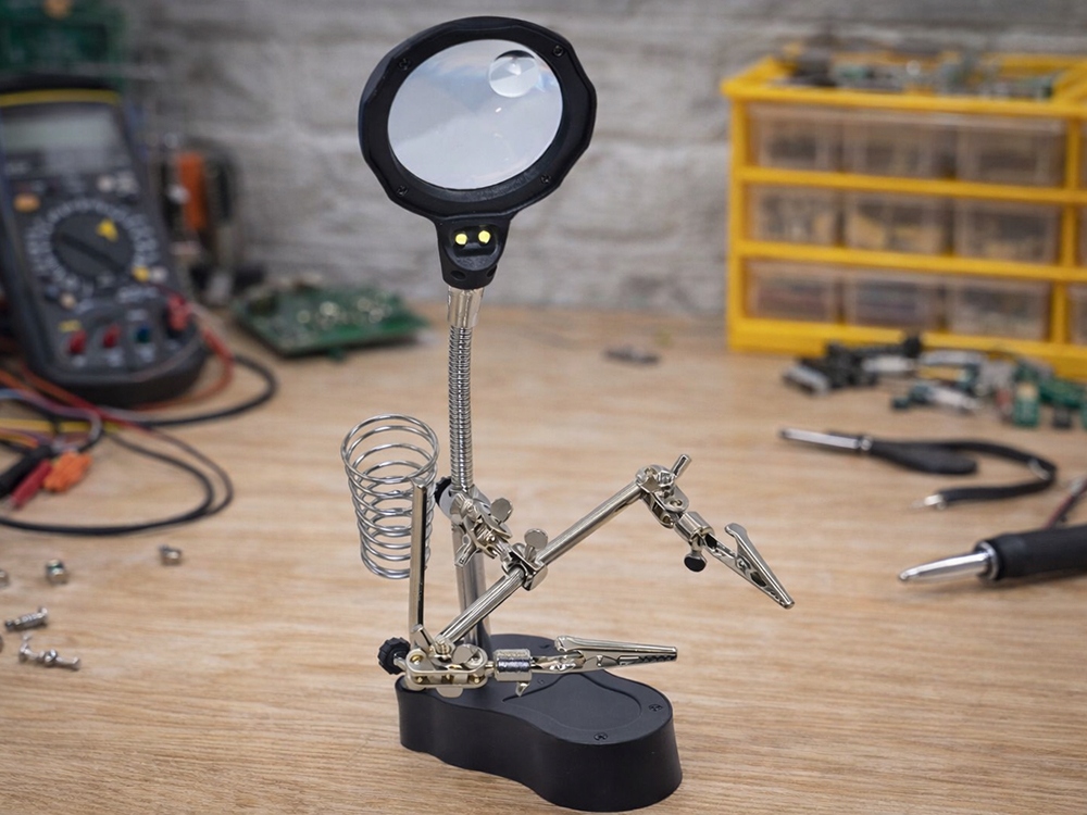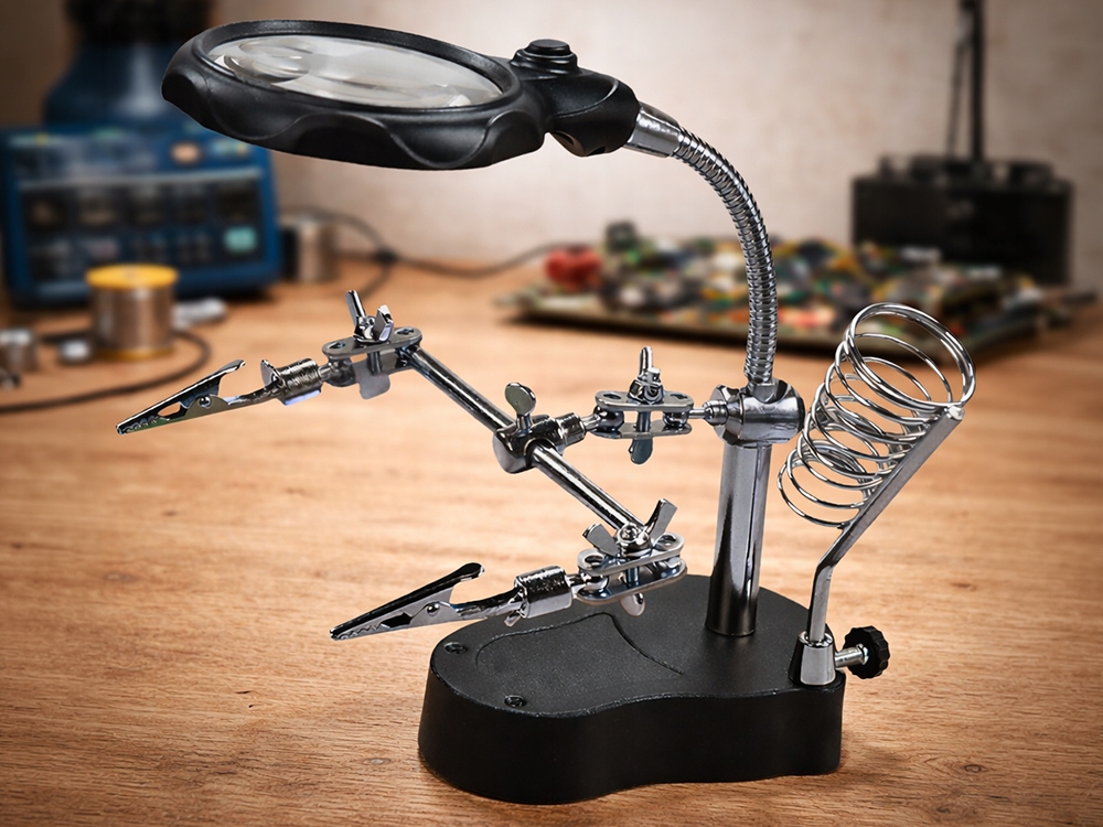 ✅ Profesionální pájecí držák typu „Třetí ruka“ s lupou a LED osvětlením je praktický nástroj, který výrazně usnadňuje přesné elektronické práce.