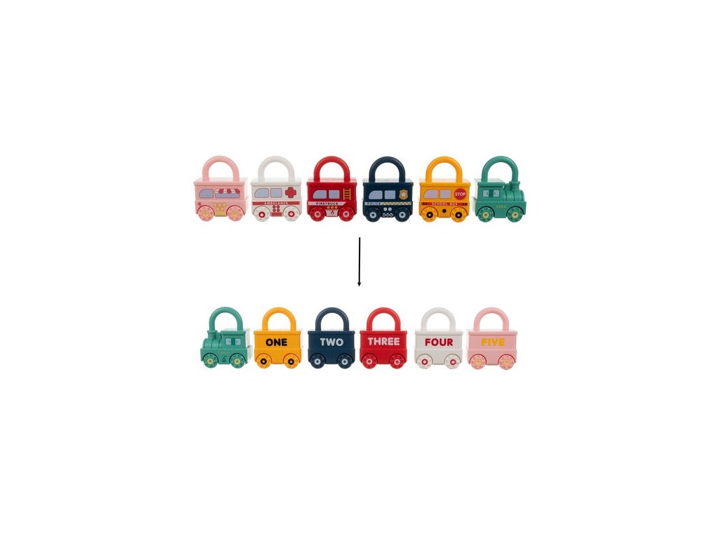 - KLÍČE A VISNÍ ZÁMKY - každý vůz má přiřazen jedinečný klíč , který pasuje pouze na jeden visací zámek , což znamená, že děti musí k otevření vozidla použít příslušný klíč. Každý klíč má tvar plyšového medvídka s otvorem v horní části a s s vyrytým číslem od 0 do 5 , což pomáhá při učení čísel. Navíc sada obsahuje: hlavní klíč který lze otevřít všechna vozidla , což přidává ještě více možností zábavy a vzdělávání. Proces párování klíčů rozvíjí koordinaci ruka-oko a logické myšlení.