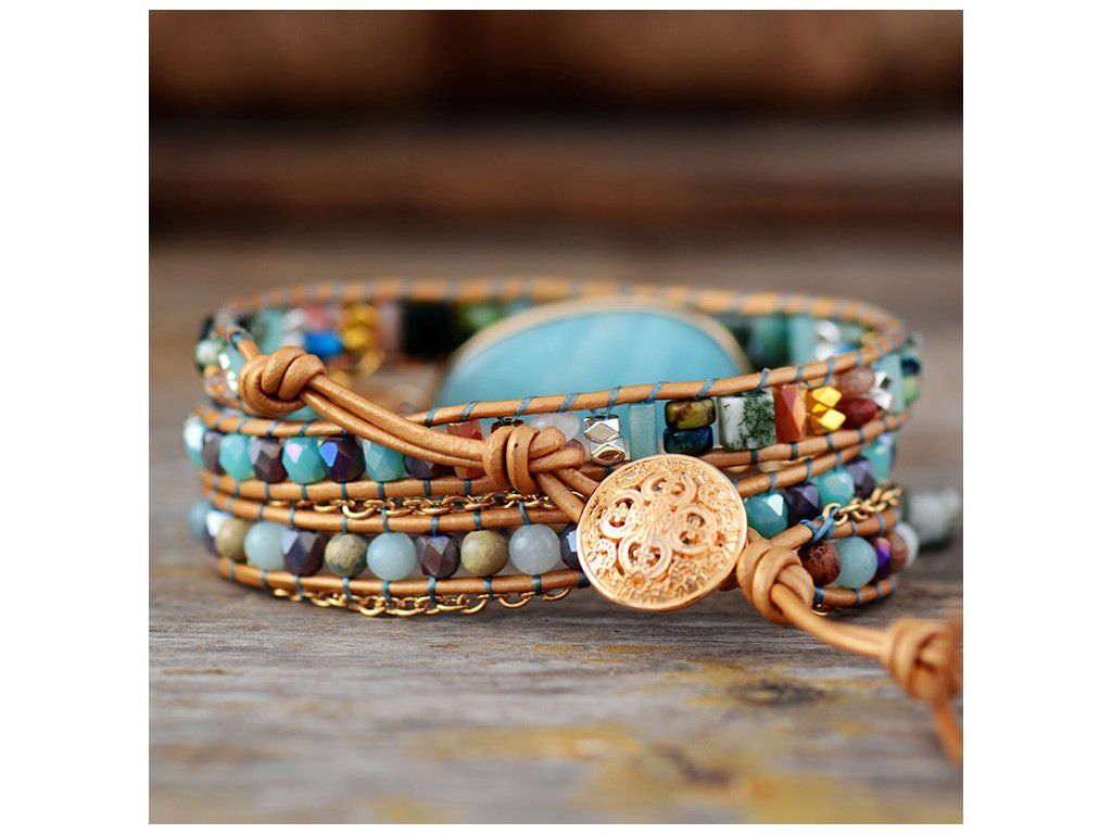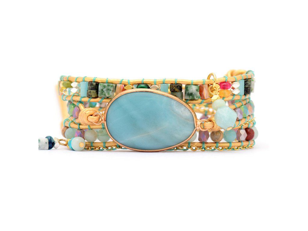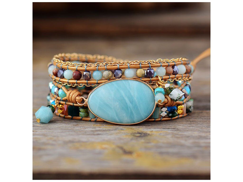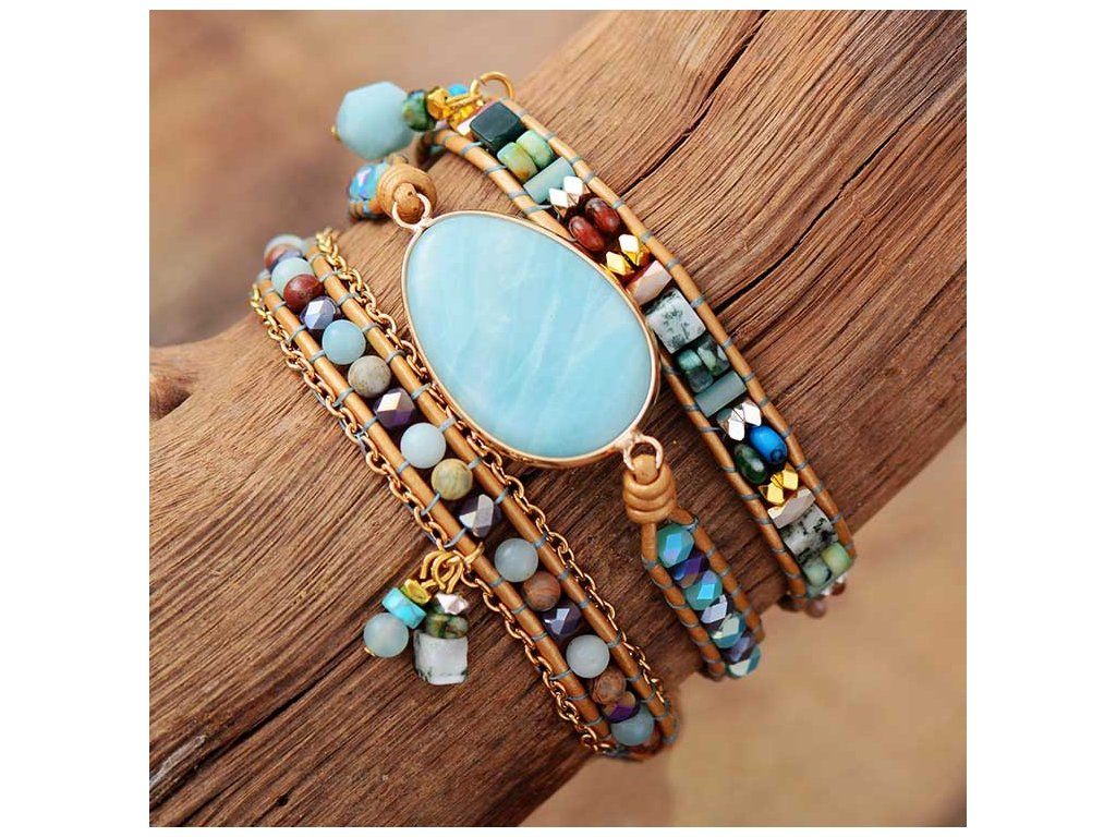 Wrap náramek Amazonit - Inspirace je elegantní šperk v etnickém stylu, který spojuje módní design a terapeutické vlastnosti tohoto vzácného kamene. S křišťálově čistým amazonitem přináší klid, harmonii a podporuje duševní zdraví. Náramek je dostupný ve třech nastavitelných velikostech, ideální pro obvod zápěstí 16 až 19 cm, a je dodáván v dárkové krabičce. Tento jedinečný kousek je skvélé jako dárek pro vás nebo vaše blízké.
