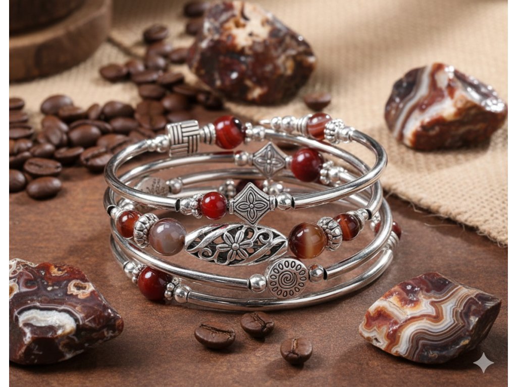 Wrap Náramek Esperanza Kávový achát je elegantní vícevrstvý šperk v etno stylu, který kombinuje hřejivé zemité odstíny přírodního achátu s detailním kovovým zdobením. Díky pružnému "wrap" designu se náramek snadno vine kolem zápěstí a tvoří bohatý, vrstvený efekt. Vyroben z kvalitních materiálů, které nedráždí pokožku, nečernají a jsou bez obsahu niklu a olova.
