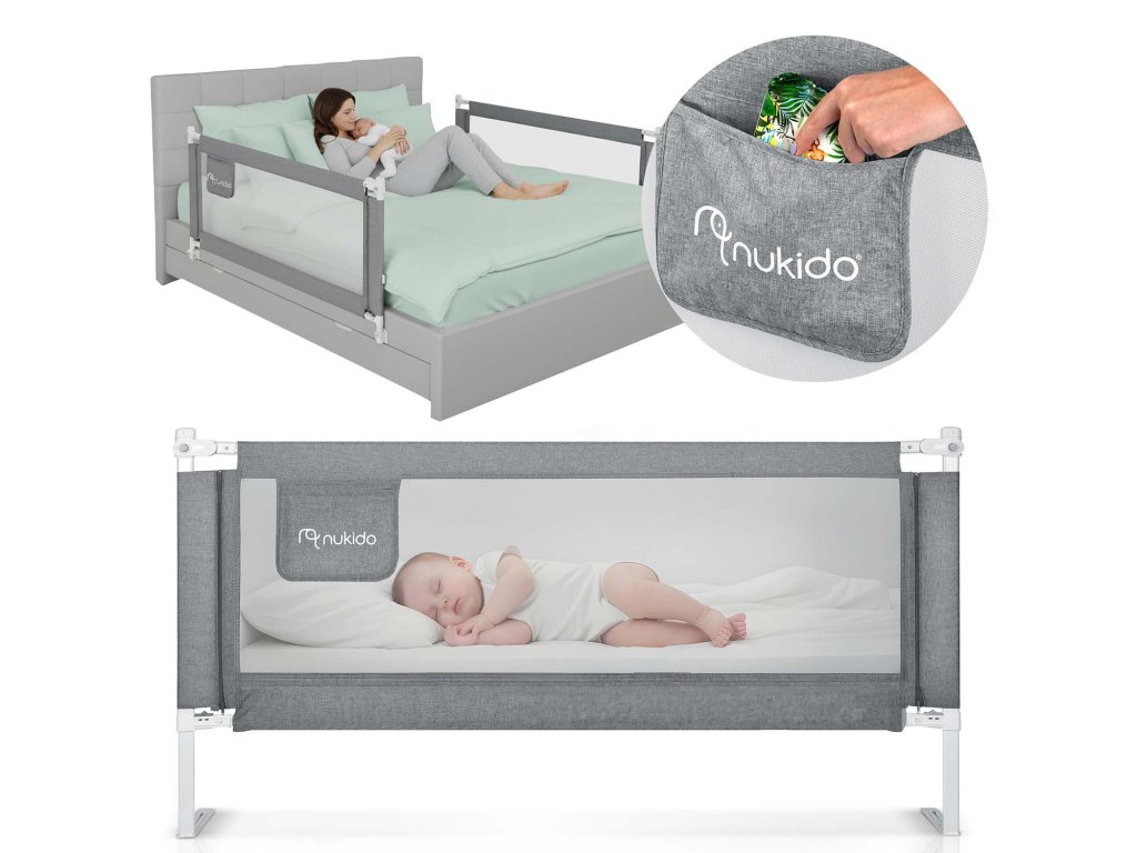 Je vaše dítě připraveno na velkou postel, ale vy se obáváte pádů během spánku? Užijte si klidné noci a bezpečný spánek s naší **\Bezpečnostní zábranou na postel Nukido 160 cm\**! Tato elegantní a praktická zábrana v šedé barvě je dokonalým řešením, které chrání vaše nejmenší a zároveň jim dodává pocit nezávislosti. S extra odolnou konstrukcí a chytrým zamykacím systémem je to investice do bezpečí, která vám usnadní přechod z dětské postýlky. Zapomeňte na starosti s komplikovanou instalací. Zábranu Nukido snadno a rychle připevníte k rámu postele, a díky funkčním prvkům, jako je praktická kapsa na dudlík a možnost snadného sklopení, se stane nepostradatelnou součástí dětského pokoje. Nejenže zajistí maximální bezpečí, ale také díky prodyšné síťovině umožňuje neustálý dohled nad spícím dítětem. S naším potahem získáváte spolehlivou ochranu, která splňuje nejpřísnější evropské normy **\BS 7972:2001 a A1:2009\**. 5 důvodů, proč si pořídit bezpečnostní zábranu Nukido: