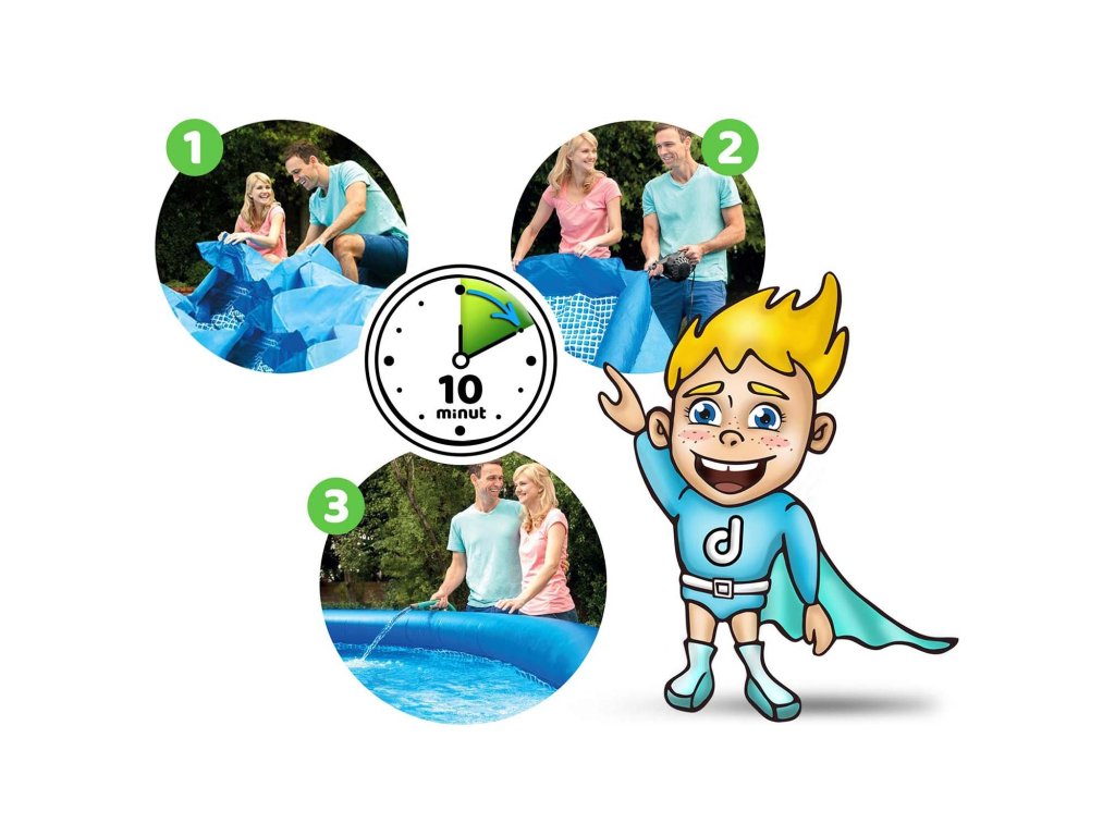 S vysoce odolným 3-vrstvým materiálem PVC a nylonovým síťovaným zpevněním je bazén nejen bezpečný, ale také odolný vůči poškození. Modrobílá mozaiková výška vnitra dodává bazénu stylový vzhled, který osvěží každou zahradu. Nečekejte na horké dny! Připravte se na nezapomenutelné zážitky, které si můžete užít s rodinou a přáteli.