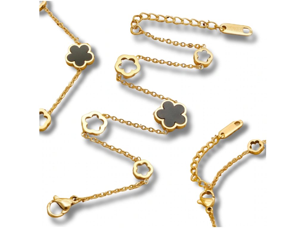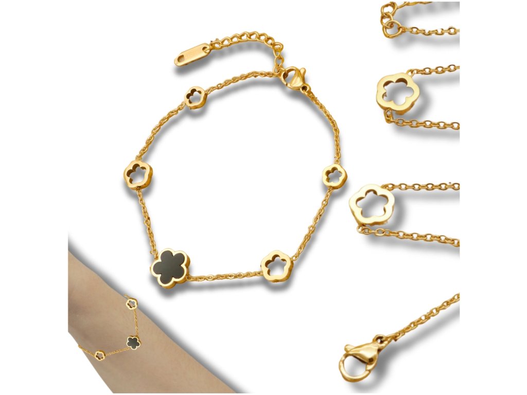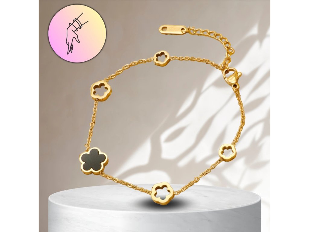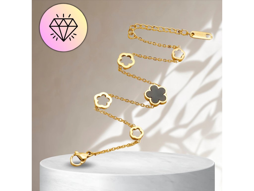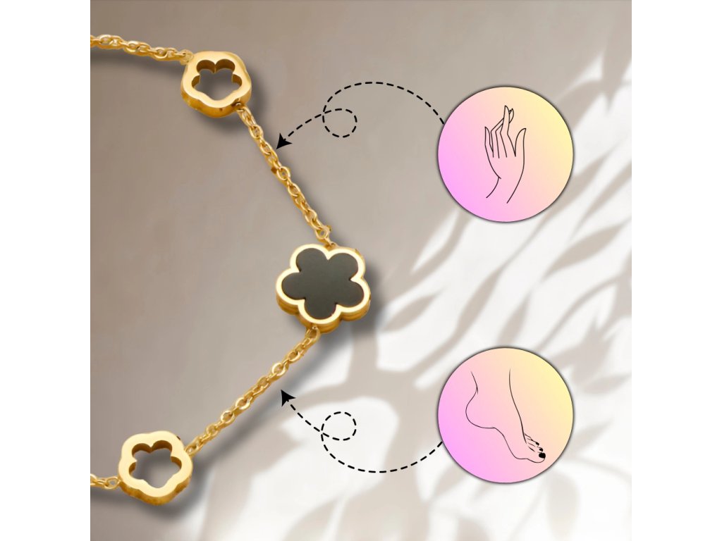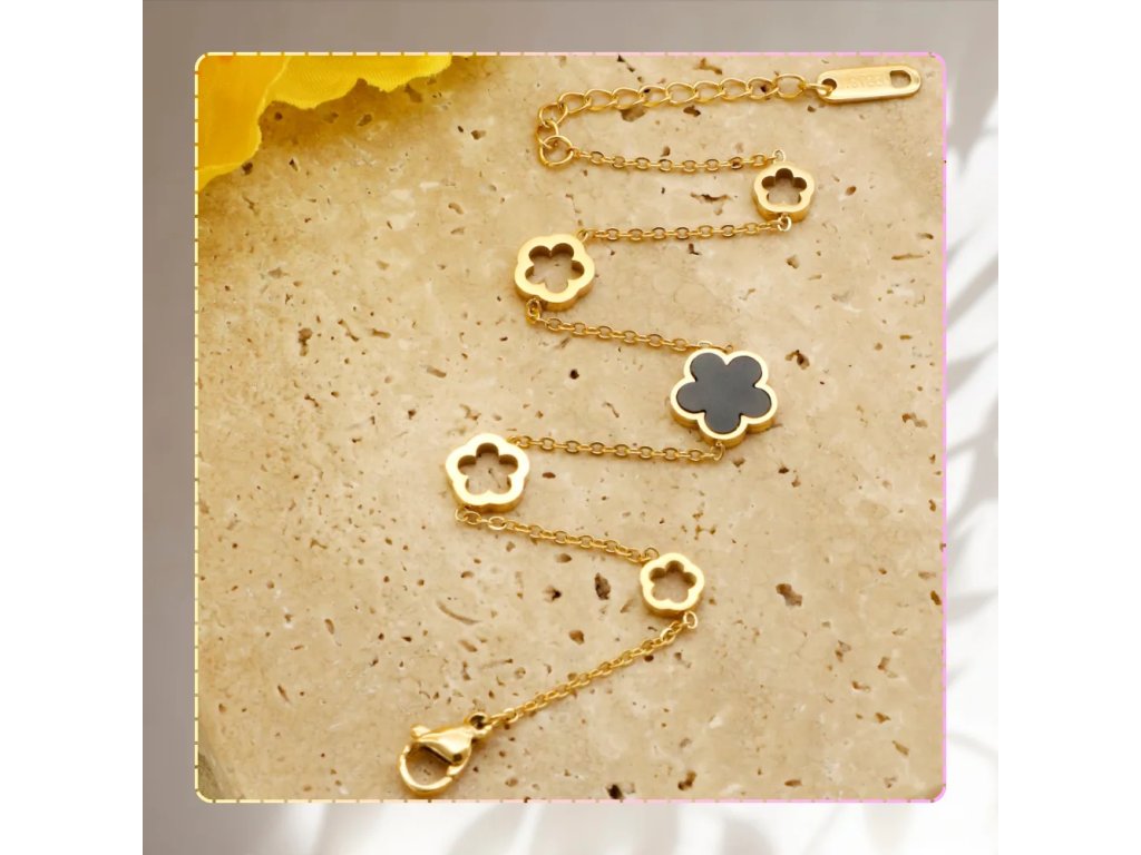 Pozlacená náramek z chirurgické oceli s černými prvky a květinovým motivem je ideálním doplňkem pro každou příležitost. Vyroben z vysoce kvalitní chirurgické oceli 316L, je ozdoben krásným černým květinovým motivem, který dodává náramku jedinečný charakter. Délka náramku je 17 cm s možností prodloužení o 3 cm, což zajišťuje perfektní přizpůsobení každému zápěstí. Karabinové zapínání zaručuje bezpečné nošení a pohodlí při každodenním používání. Tento pozlacený náramek se hodí jak k elegantním outfitům, tak ke každodenním stylizacím.